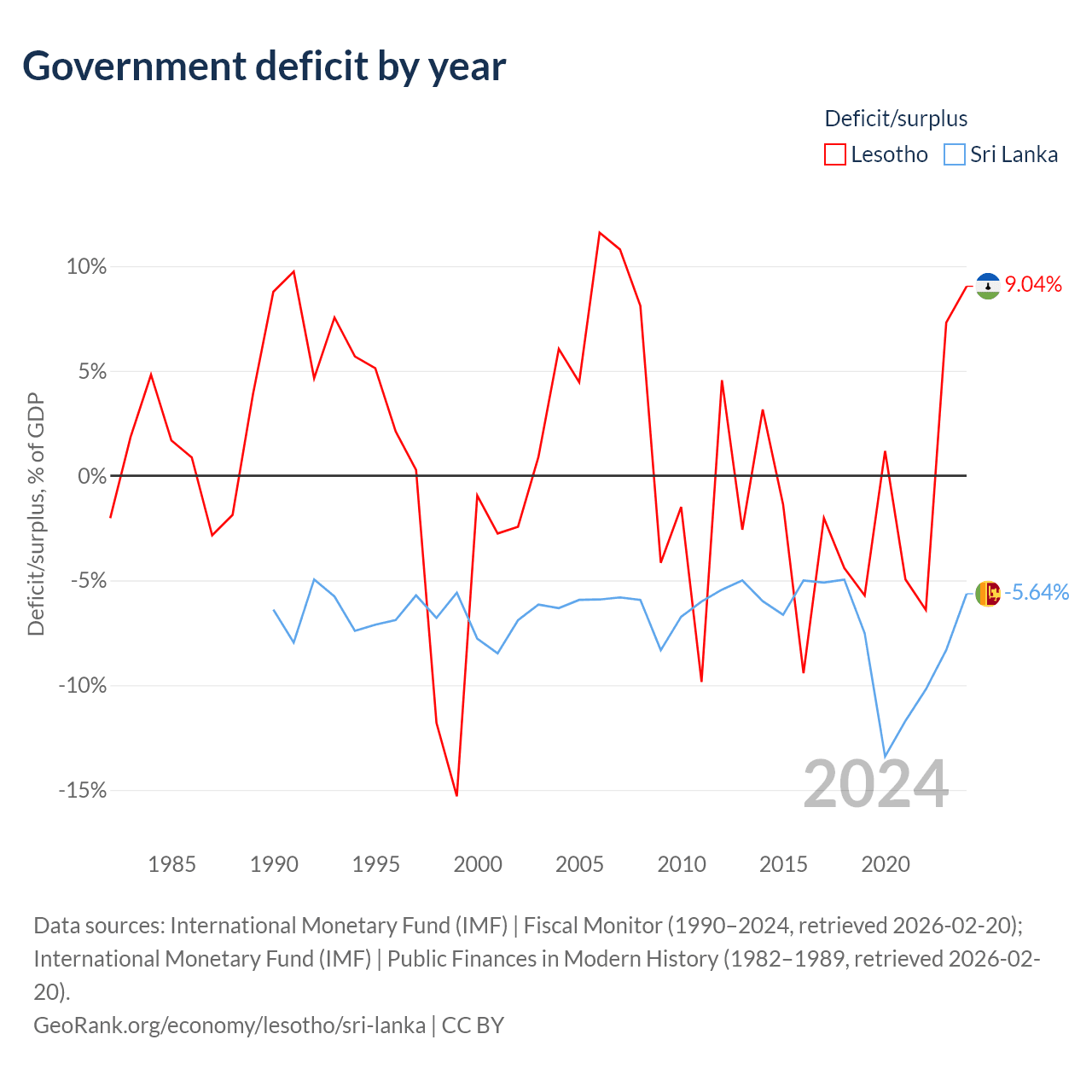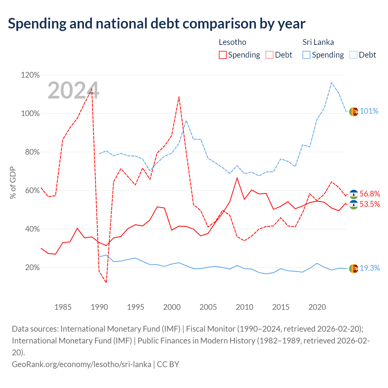 Lesotho has $1.29B in government debt (56.8% of GDP), compared to $99.8B (100.8% of GDP) in Sri Lanka.