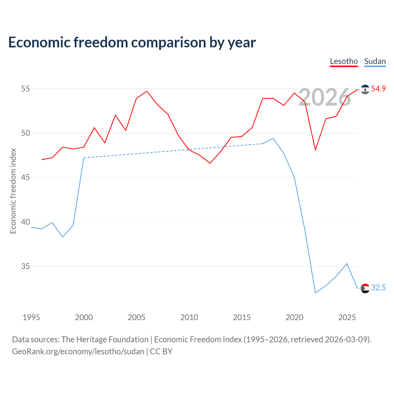 The Economic Freedom Index for Lesotho is 54.9, ranking 130/197, compared to 32.5 for Sudan, ranking 191/197. The chart above displays a comparison of annual changes in economic freedom indexes.