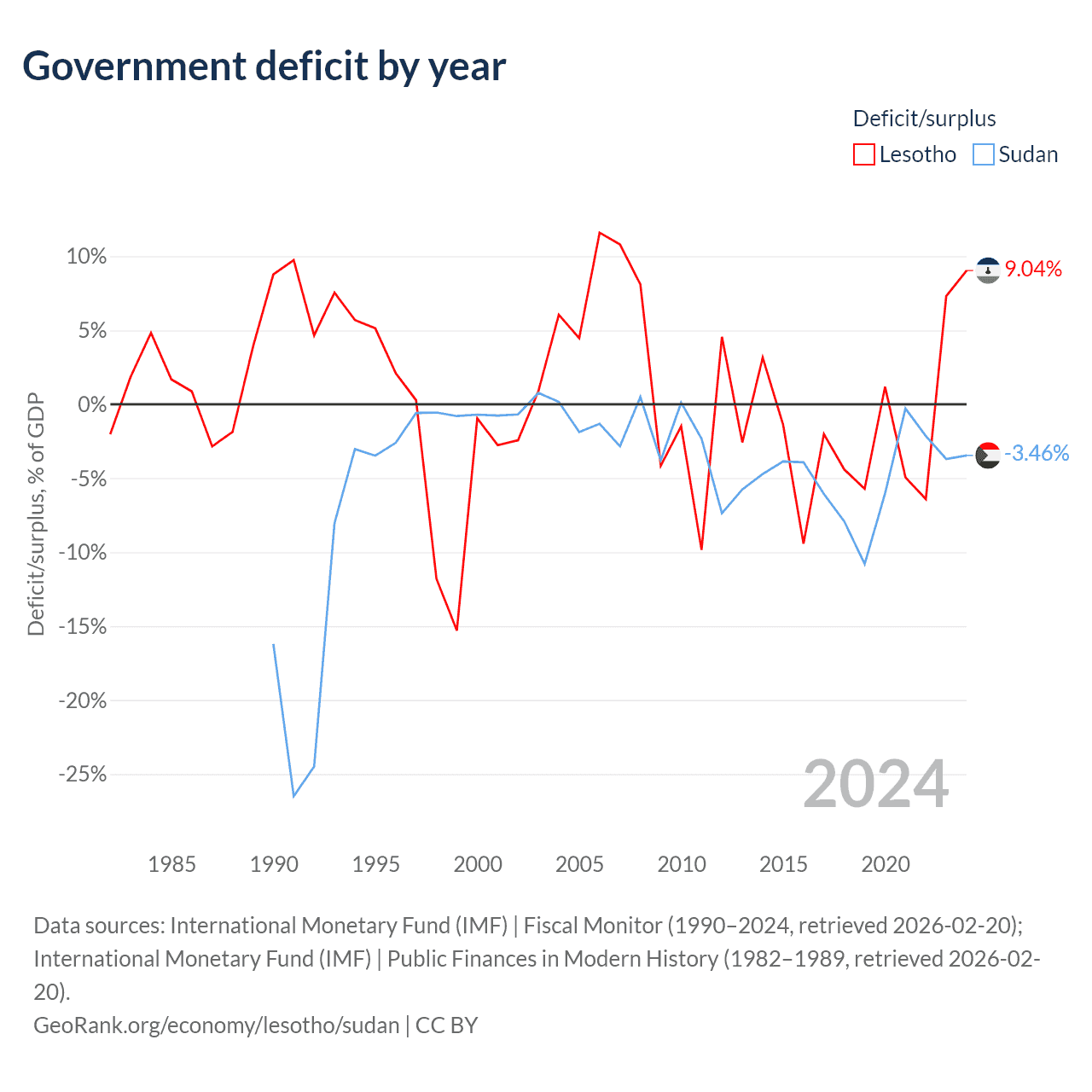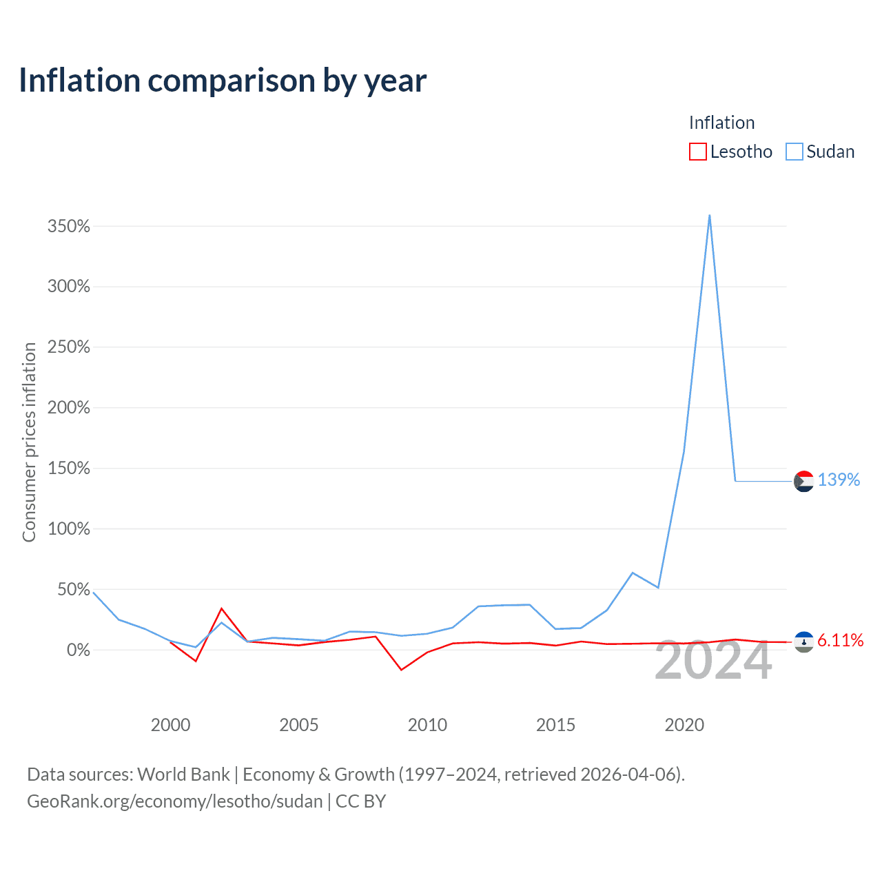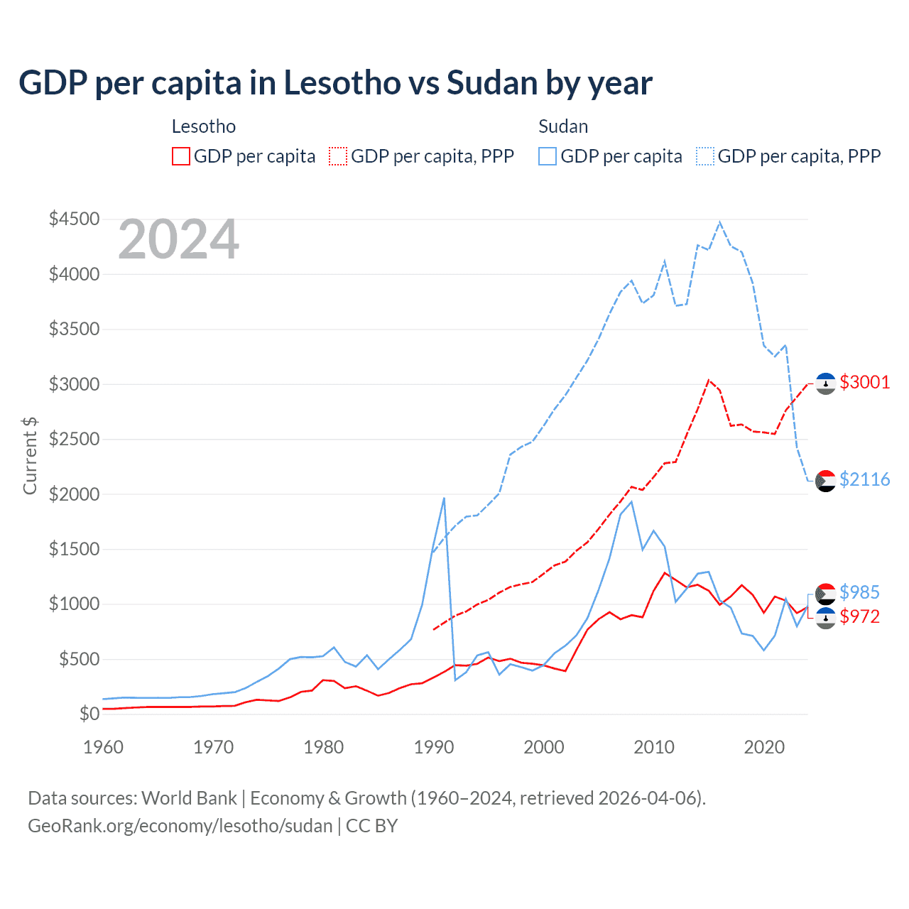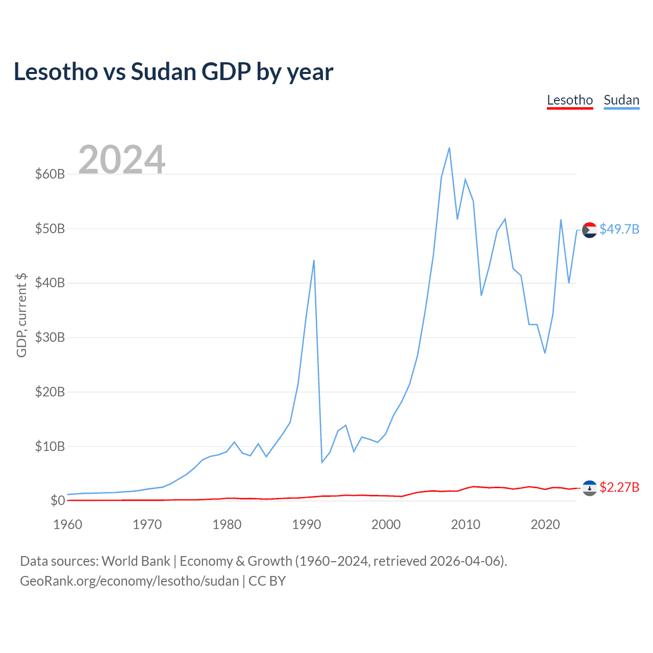 Lesotho has a GDP of $2.27B compared to $49.7B for Sudan, ranking 175/197 and 94/197 by economy size, respectively.