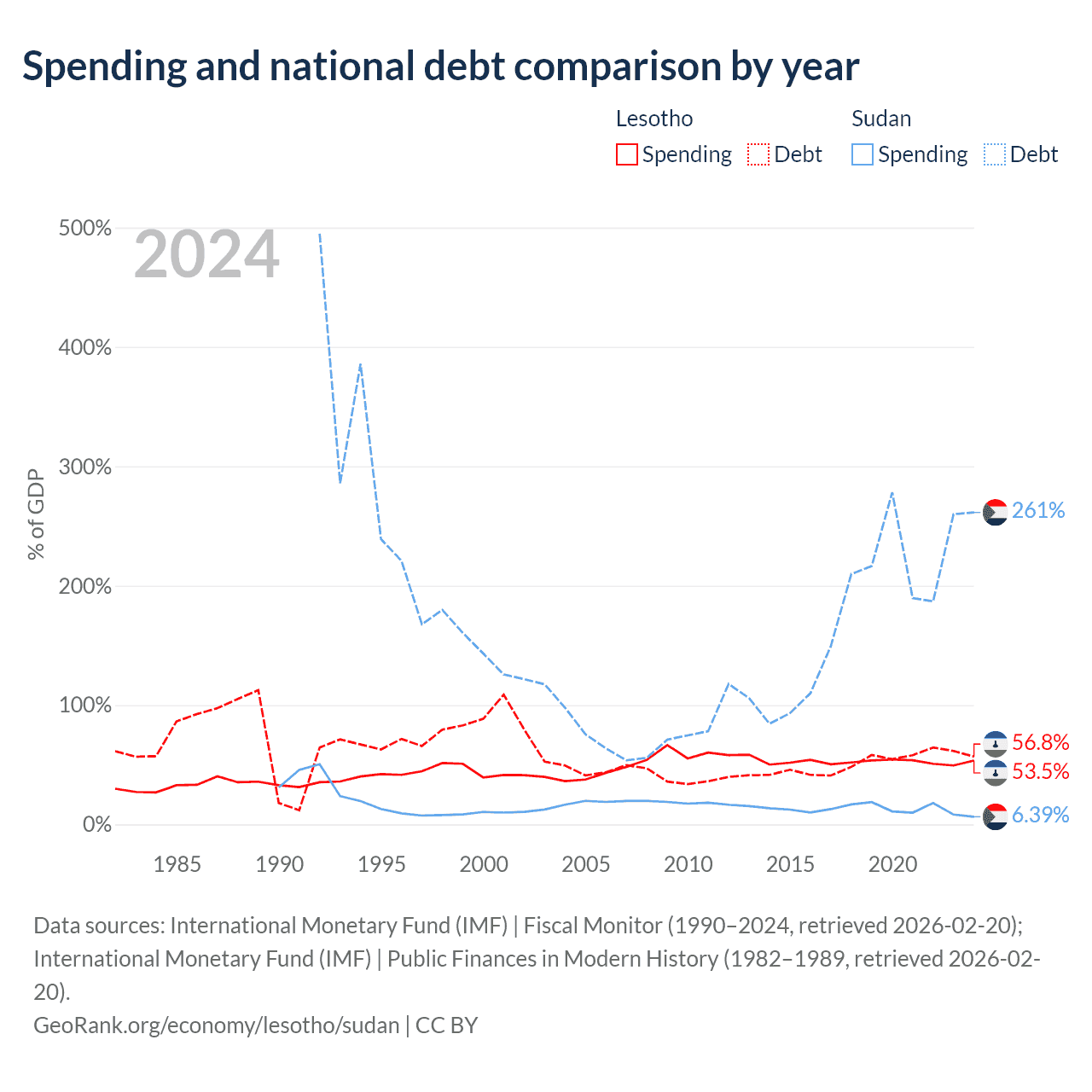 Lesotho has $1.29B in government debt (56.8% of GDP), compared to $130B (261.4% of GDP) in Sudan.