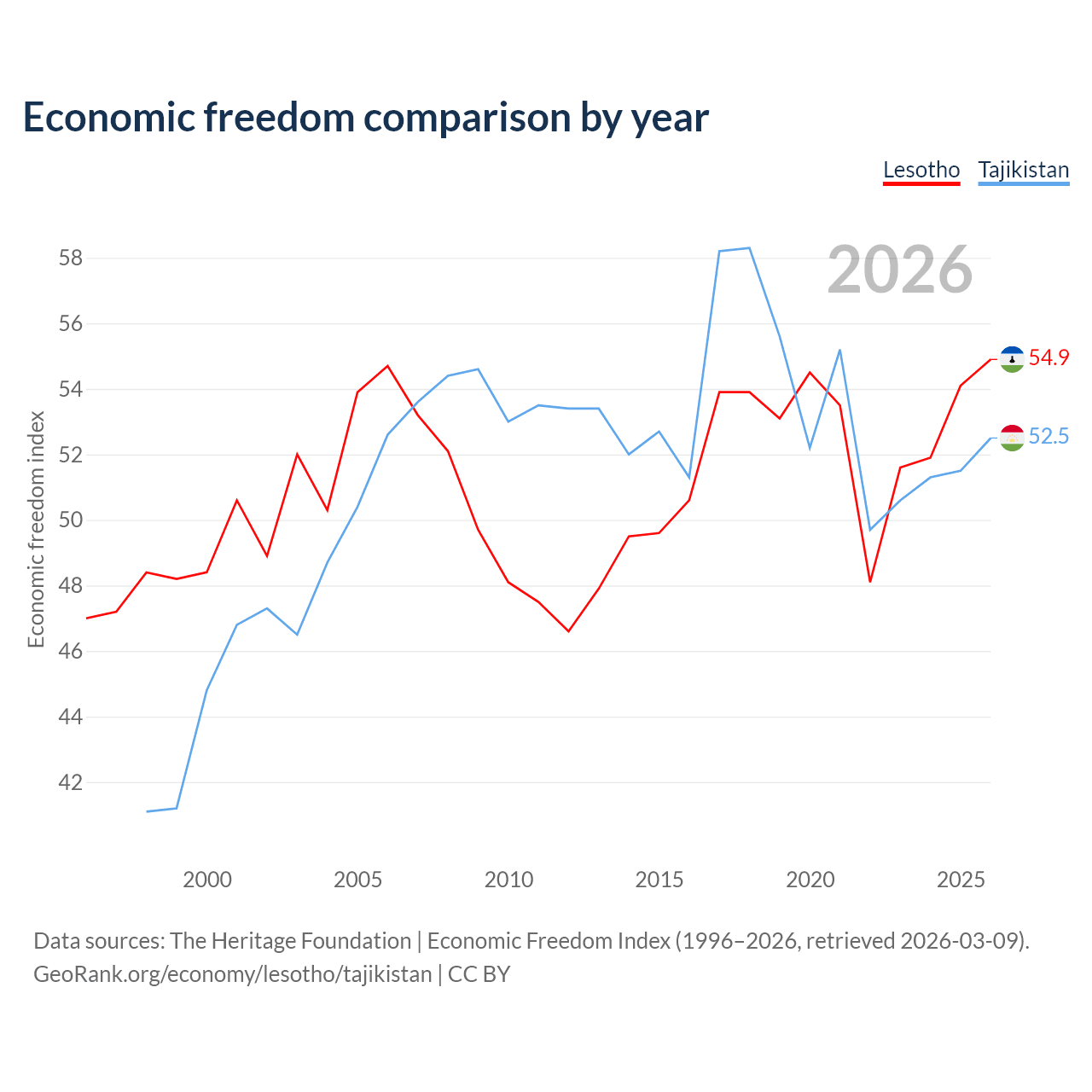 The Economic Freedom Index for Lesotho is 54.9, ranking 130/197, compared to 52.5 for Tajikistan, ranking 147/197. The chart above displays a comparison of annual changes in economic freedom indexes.