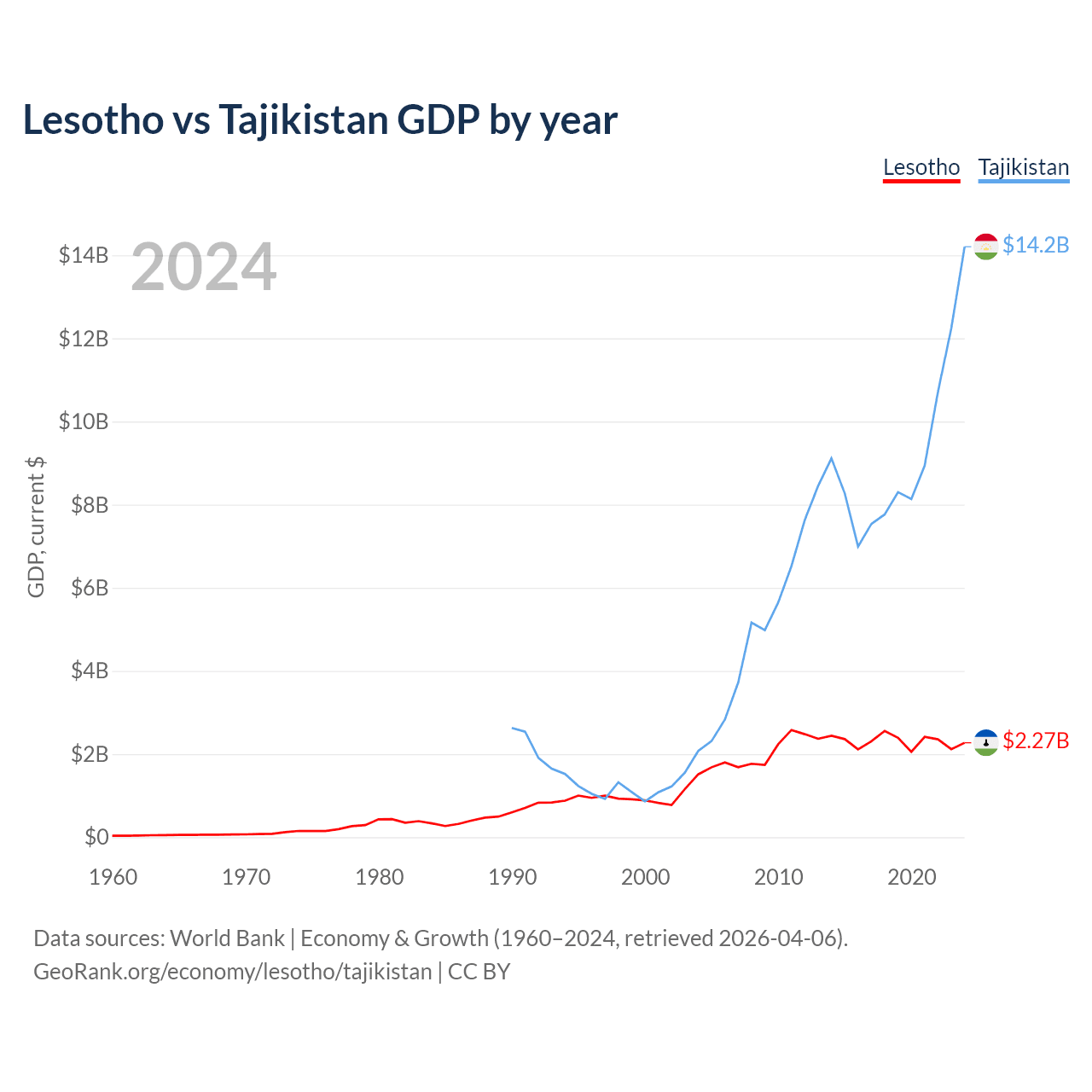 Lesotho has a GDP of $2.27B compared to $14.2B for Tajikistan, ranking 175/197 and 145/197 by economy size, respectively.