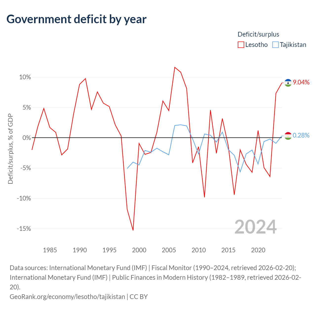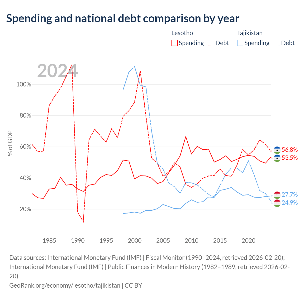Lesotho has $1.29B in government debt (56.8% of GDP), compared to $3.54B (24.9% of GDP) in Tajikistan.