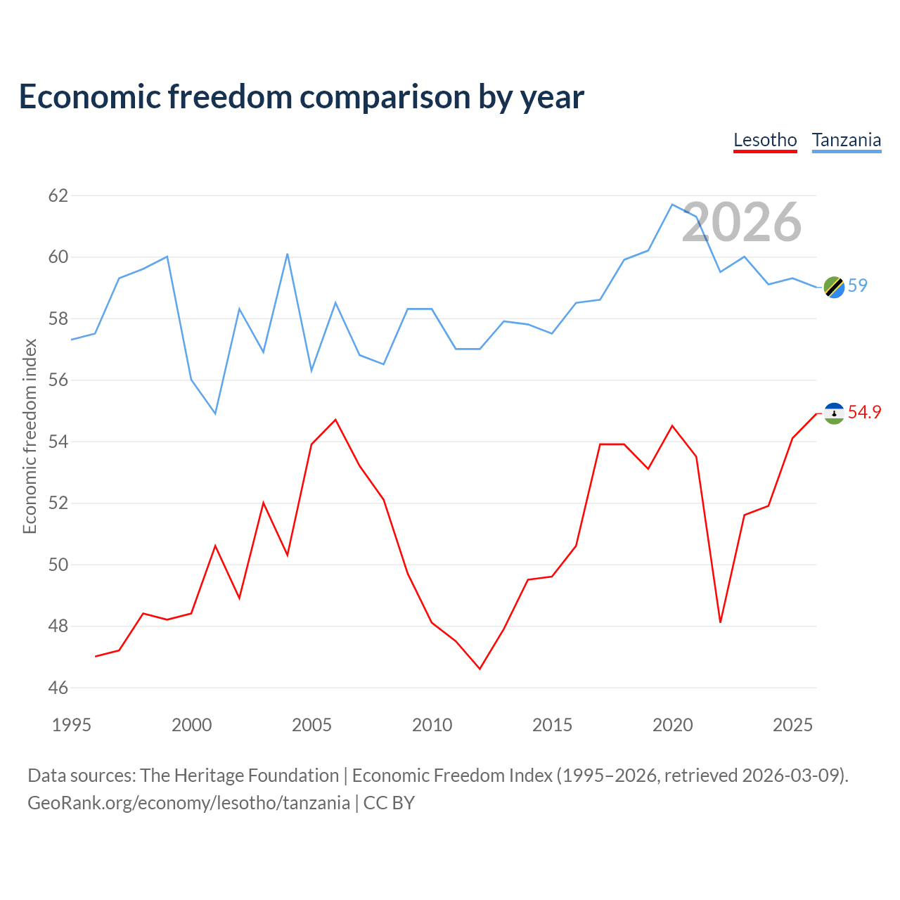 The Economic Freedom Index for Lesotho is 54.9, ranking 130/197, compared to 59 for Tanzania, ranking 106/197. The chart above displays a comparison of annual changes in economic freedom indexes.