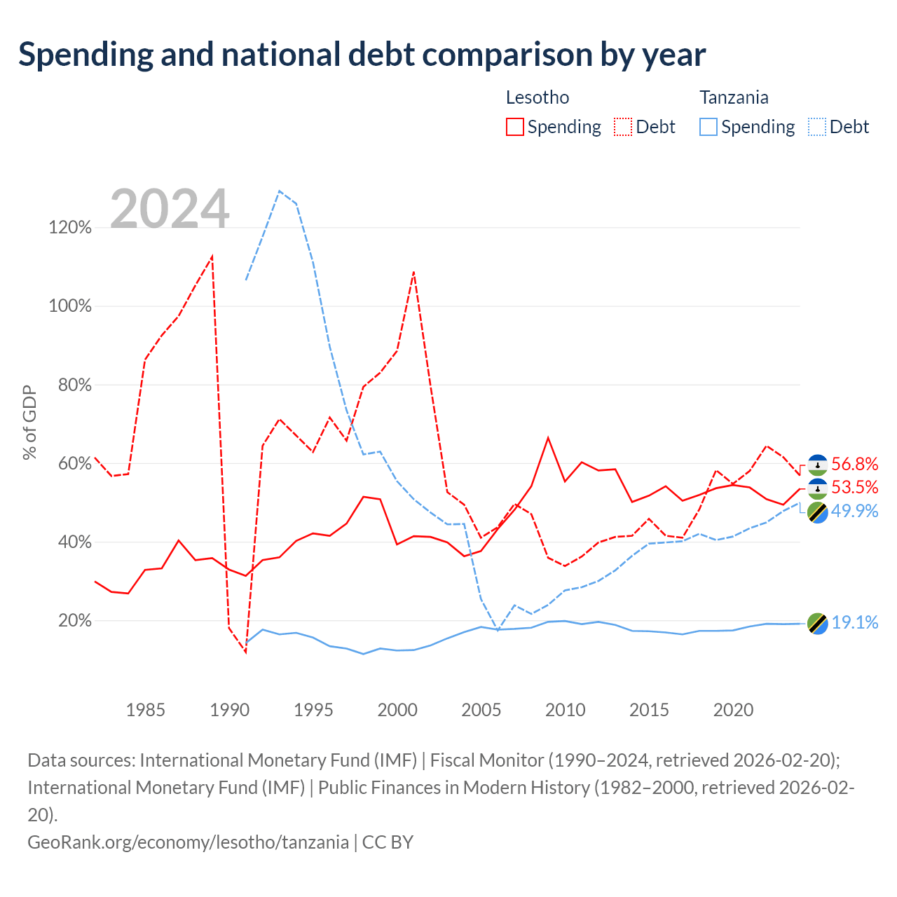 Lesotho has $1.29B in government debt (56.8% of GDP), compared to $39.3B (49.9% of GDP) in Tanzania.