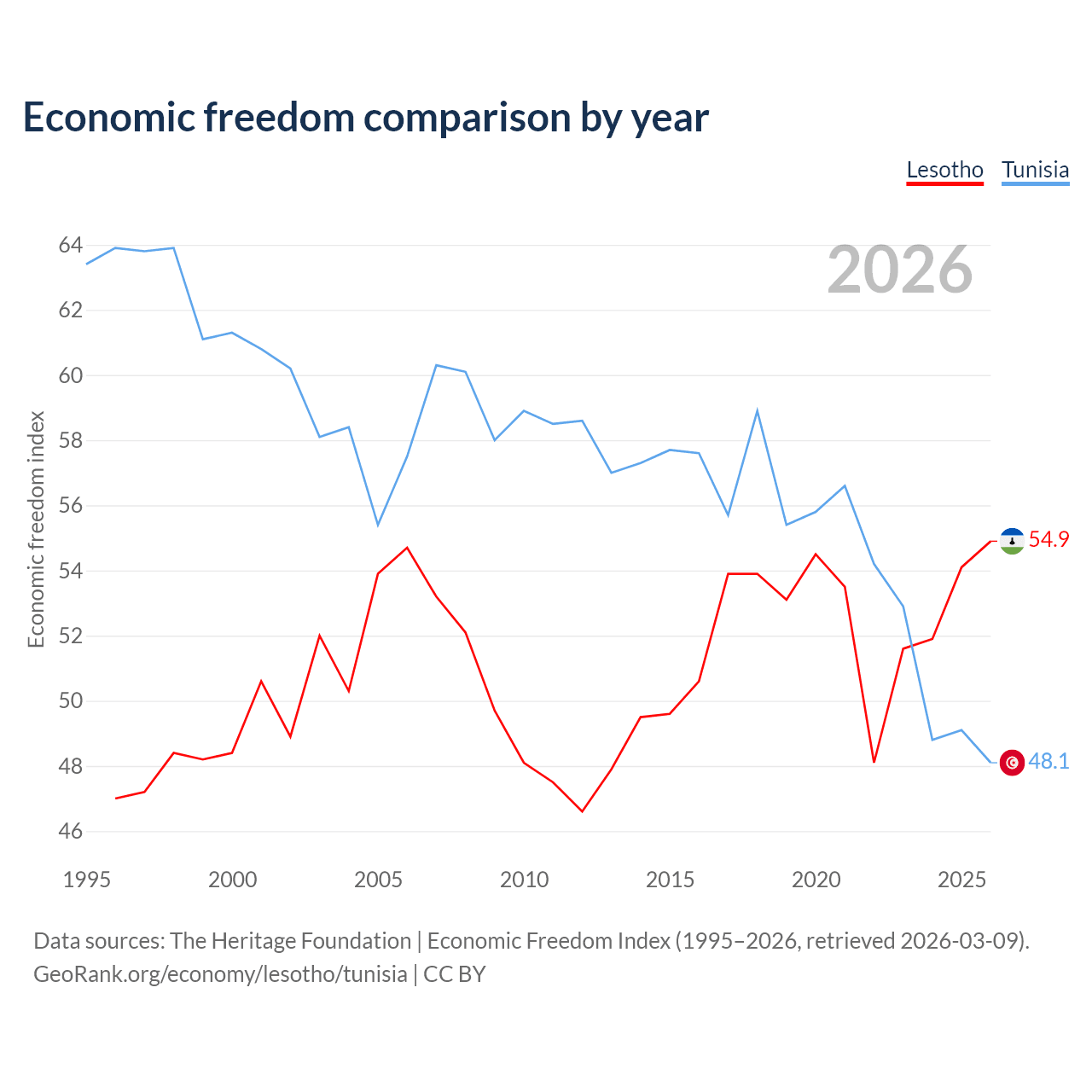 The Economic Freedom Index for Lesotho is 54.9, ranking 130/197, compared to 48.1 for Tunisia, ranking 172/197. The chart above displays a comparison of annual changes in economic freedom indexes.