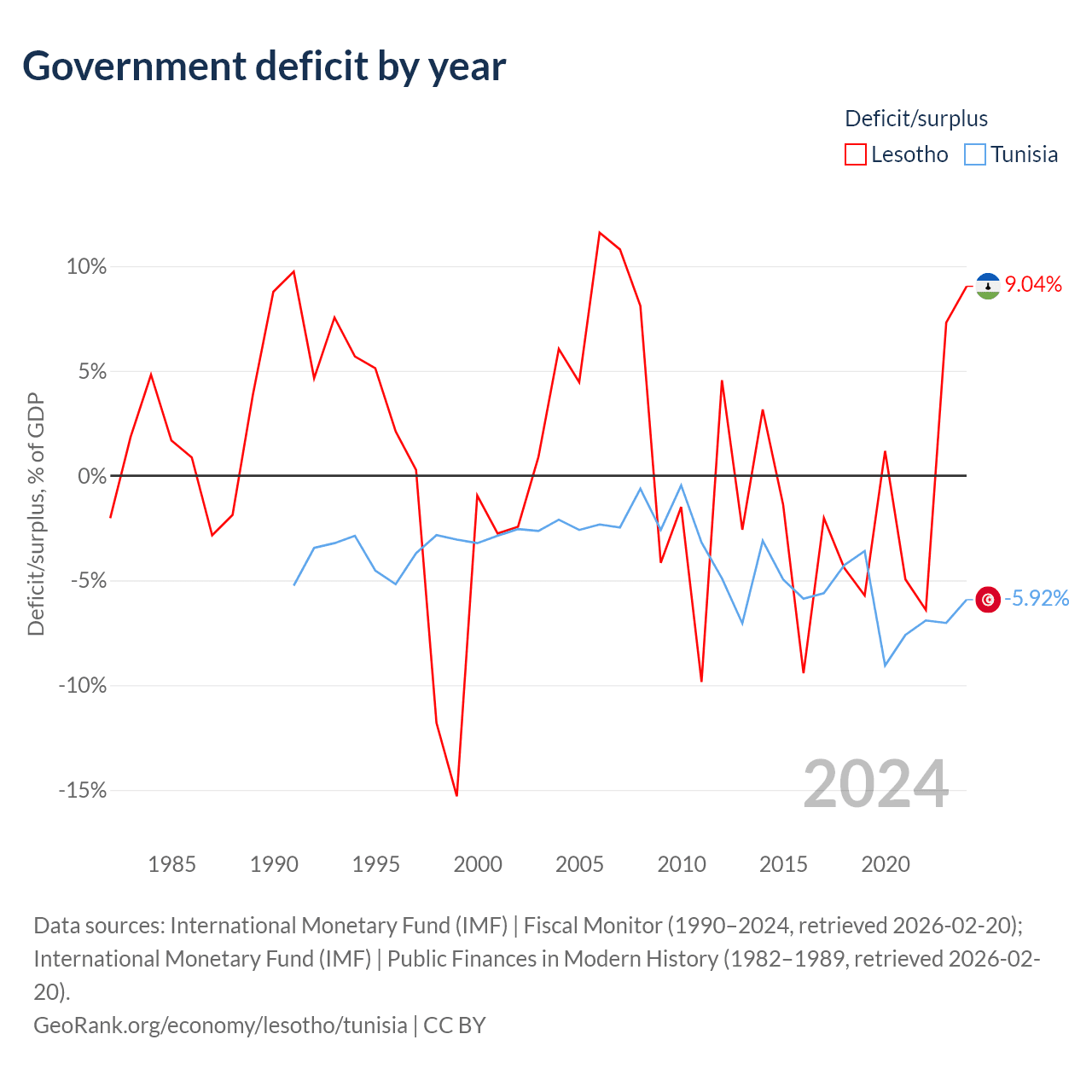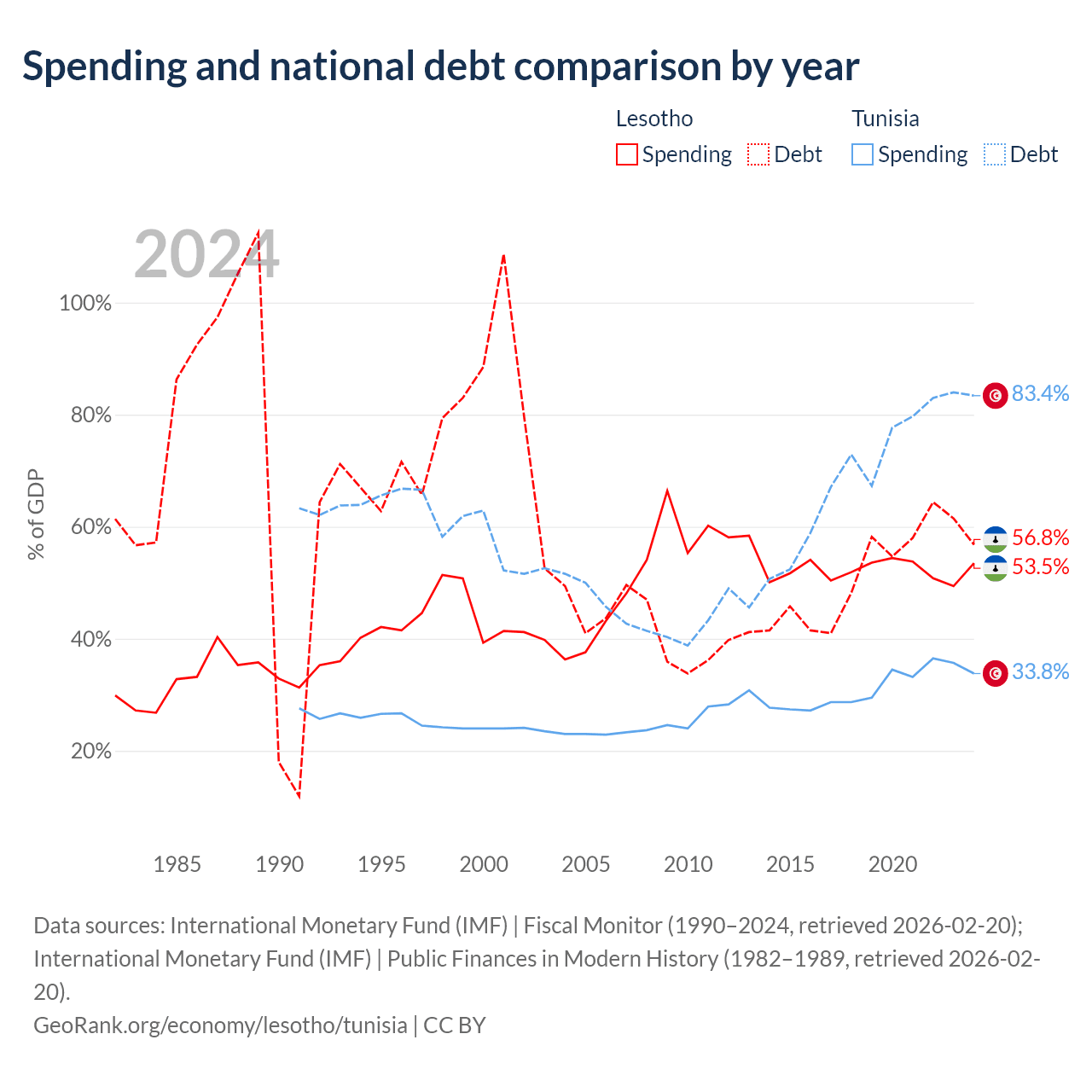 Lesotho has $1.29B in government debt (56.8% of GDP), compared to $42.8B (83.4% of GDP) in Tunisia.