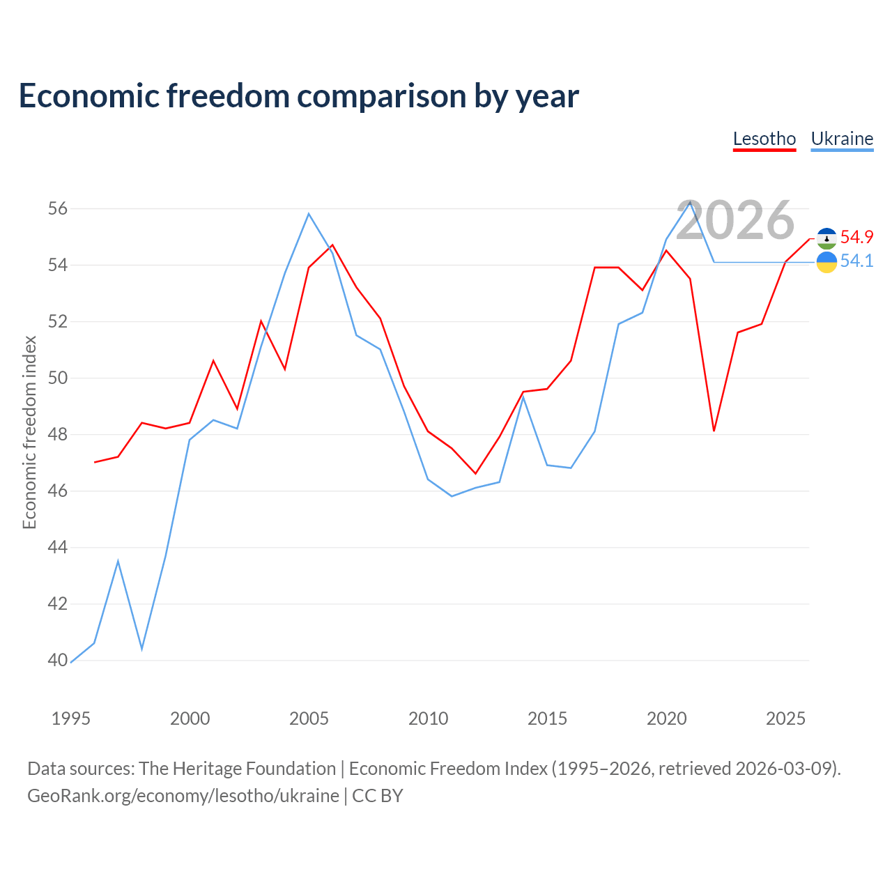 The Economic Freedom Index for Lesotho is 54.9, ranking 130/197, compared to 54.1 for Ukraine, ranking 135/197. The chart above displays a comparison of annual changes in economic freedom indexes.