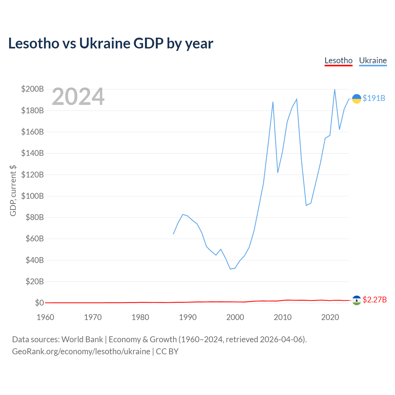Lesotho has a GDP of $2.27B compared to $191B for Ukraine, ranking 175/197 and 57/197 by economy size, respectively.