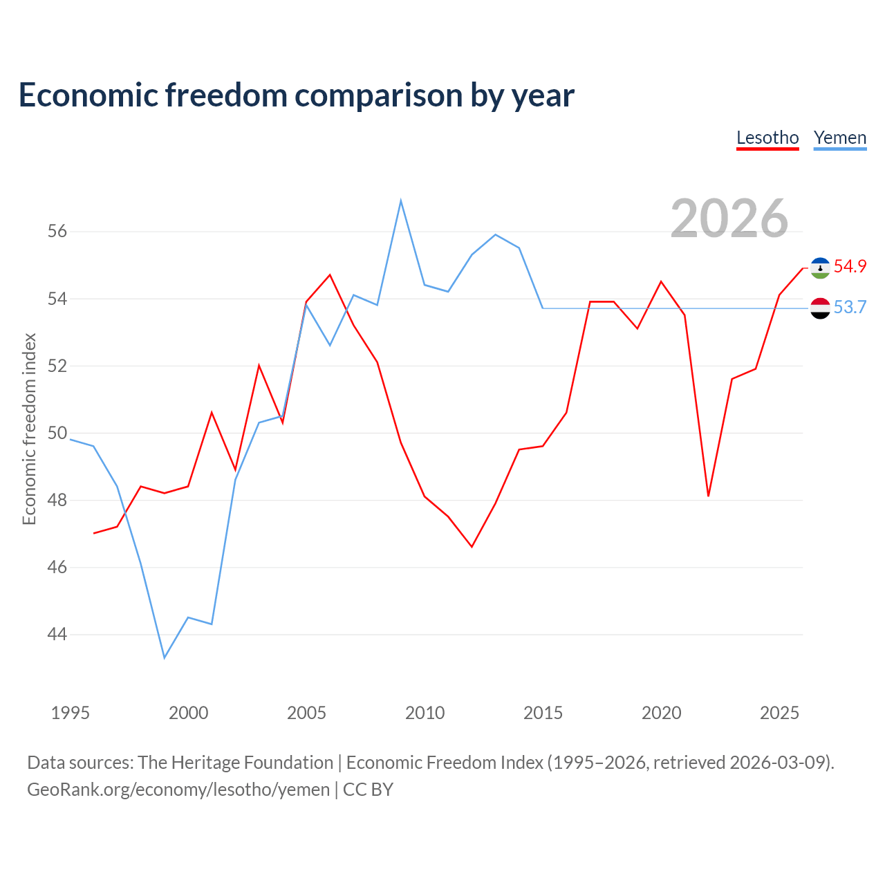 The Economic Freedom Index for Lesotho is 54.9, ranking 130/197, compared to 53.7 for Yemen, ranking 138/197. The chart above displays a comparison of annual changes in economic freedom indexes.