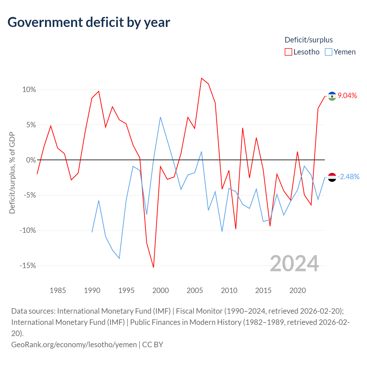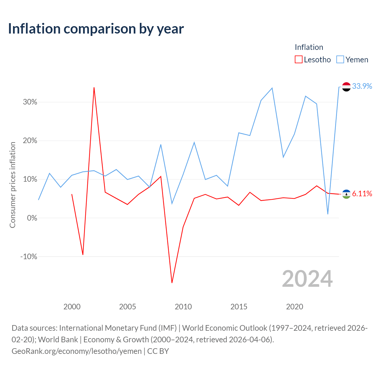 Lesotho has a GDP of $2.27B compared to $21.6B for Yemen, ranking 175/197 and 125/197 by economy size, respectively.