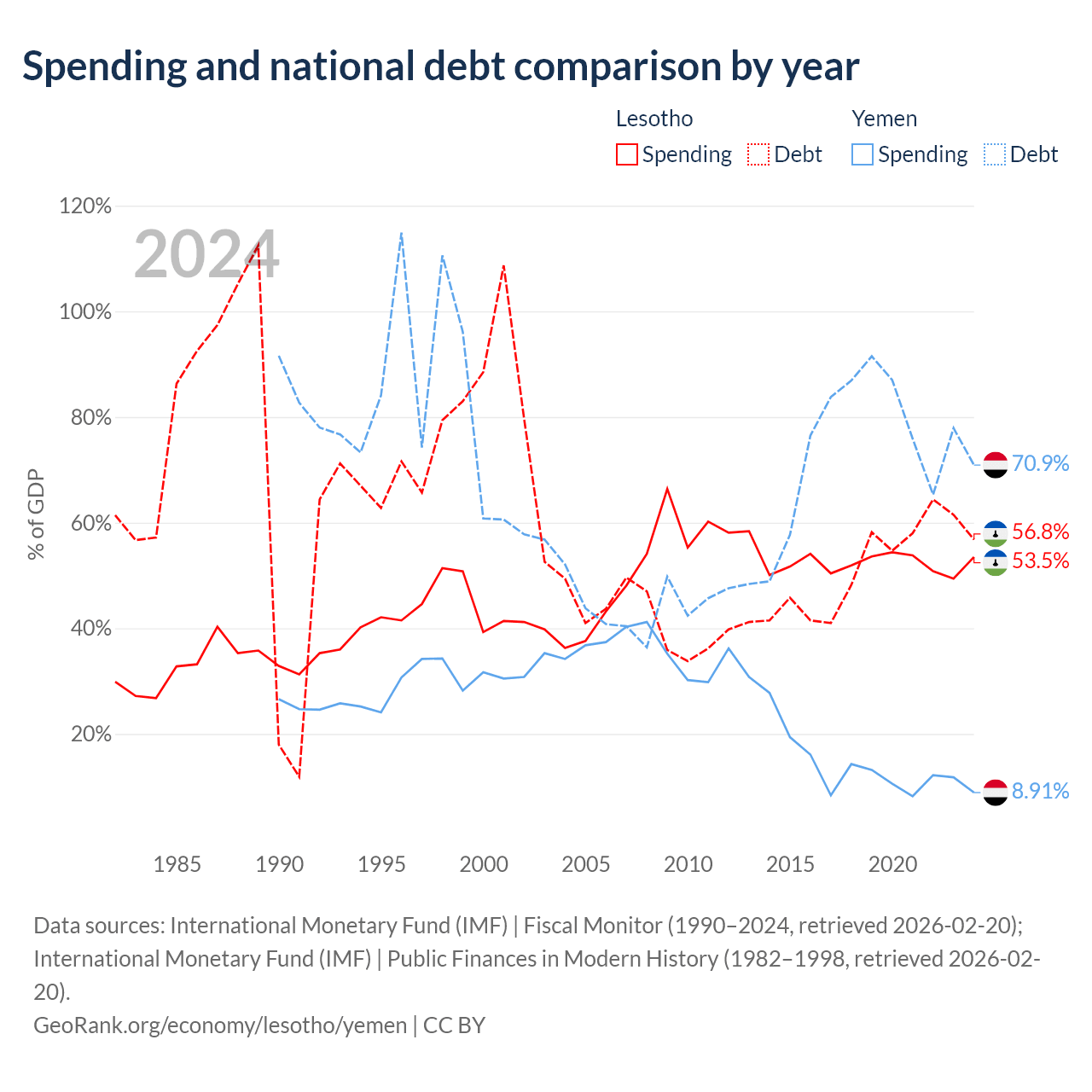 Lesotho has $1.29B in government debt (56.8% of GDP), compared to $18.8B (70.9% of GDP) in Yemen.