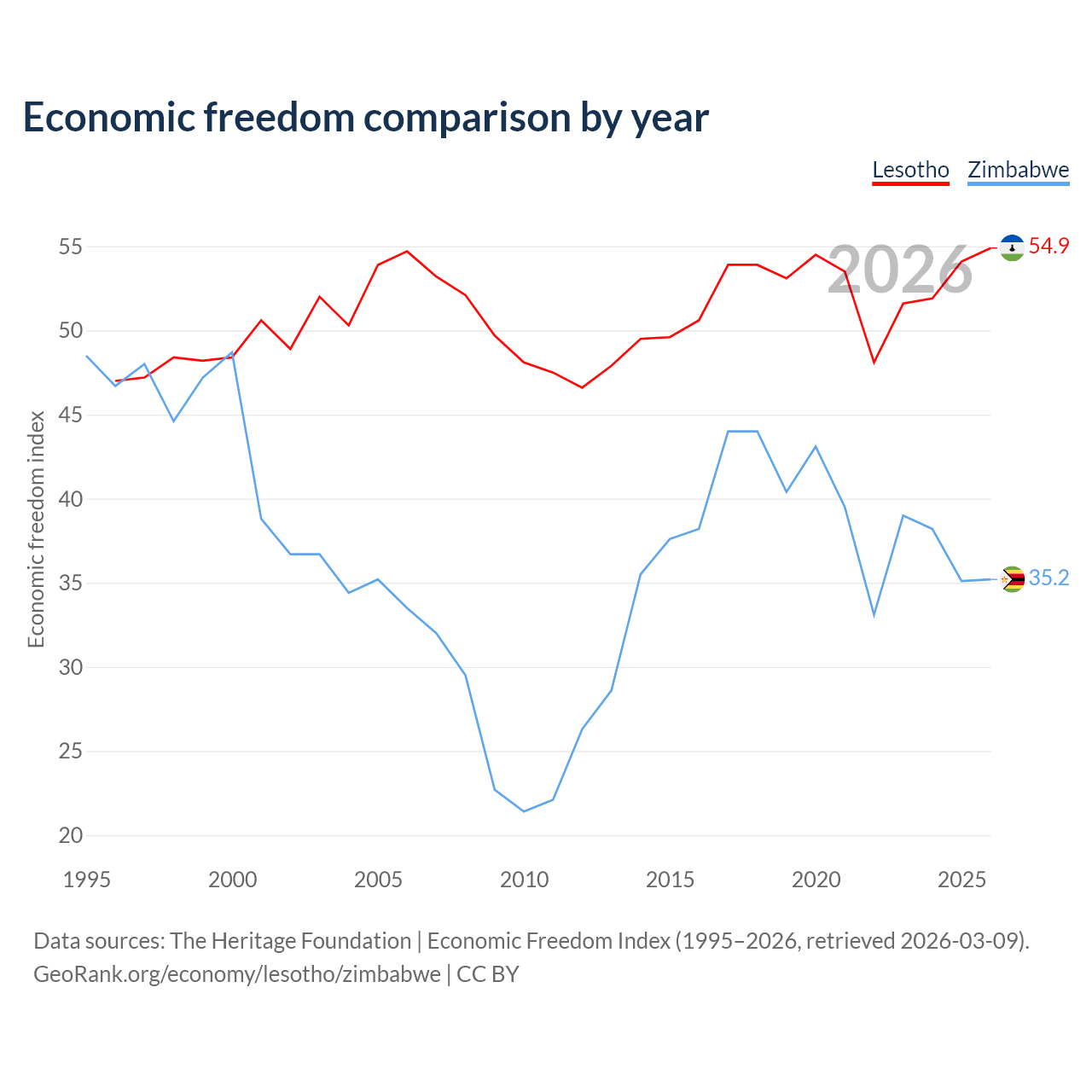 The Economic Freedom Index for Lesotho is 54.9, ranking 130/197, compared to 35.2 for Zimbabwe, ranking 190/197. The chart above displays a comparison of annual changes in economic freedom indexes.