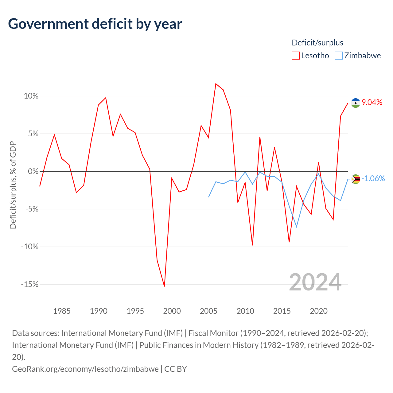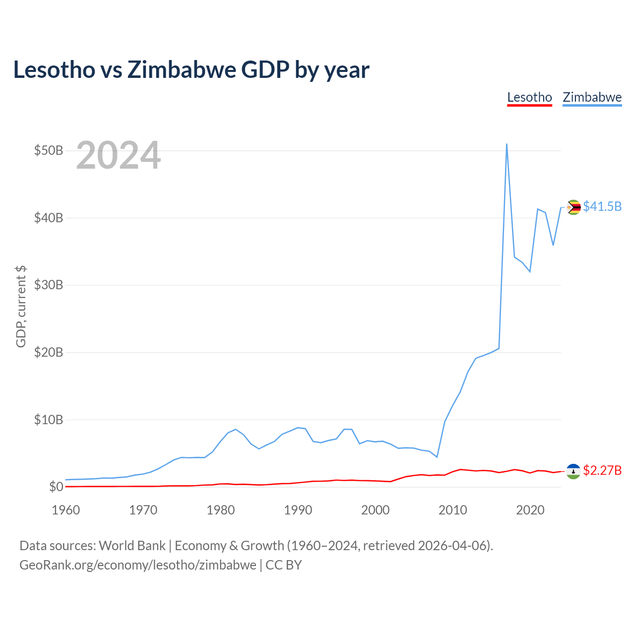 Lesotho has a GDP of $2.27B compared to $41.5B for Zimbabwe, ranking 175/197 and 102/197 by economy size, respectively.