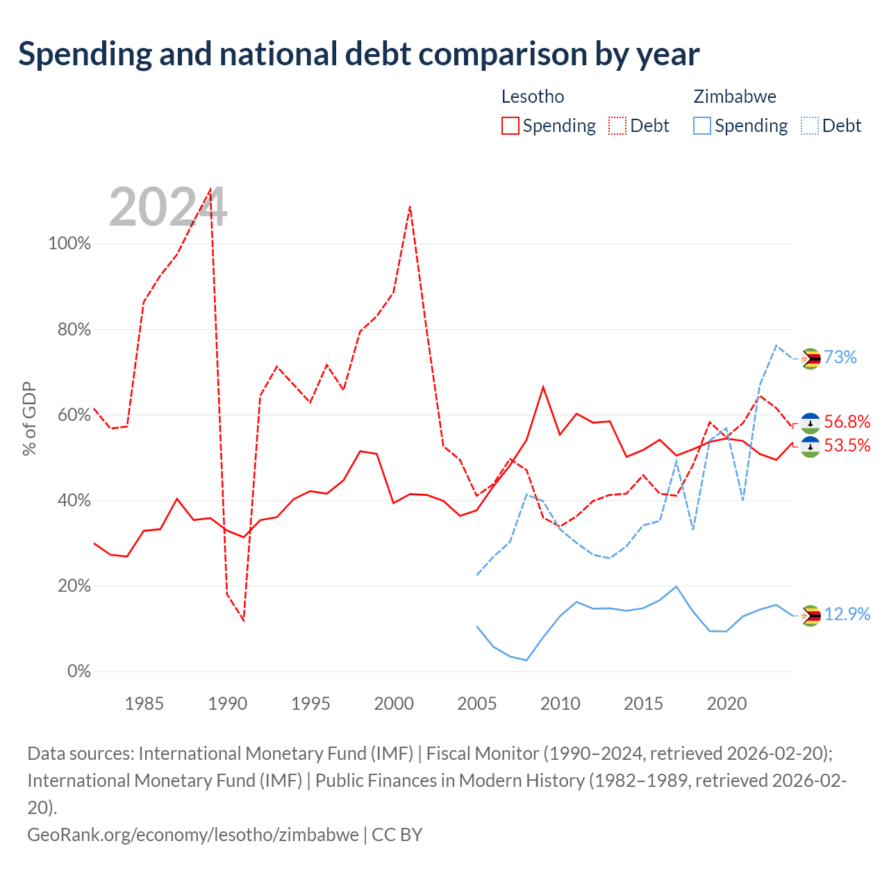 Lesotho has $1.29B in government debt (56.8% of GDP), compared to $30.3B (73% of GDP) in Zimbabwe.