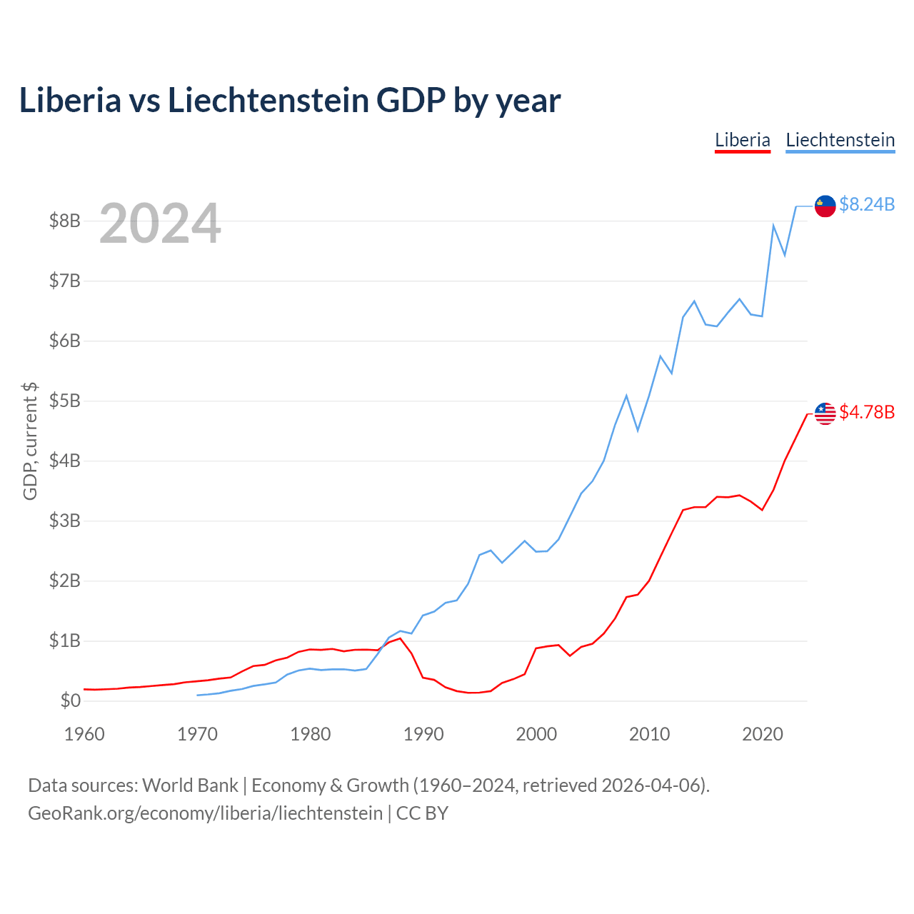 Liberia has a GDP of $4.78B compared to $8.24B for Liechtenstein, ranking 163/197 and 156/197 by economy size, respectively.