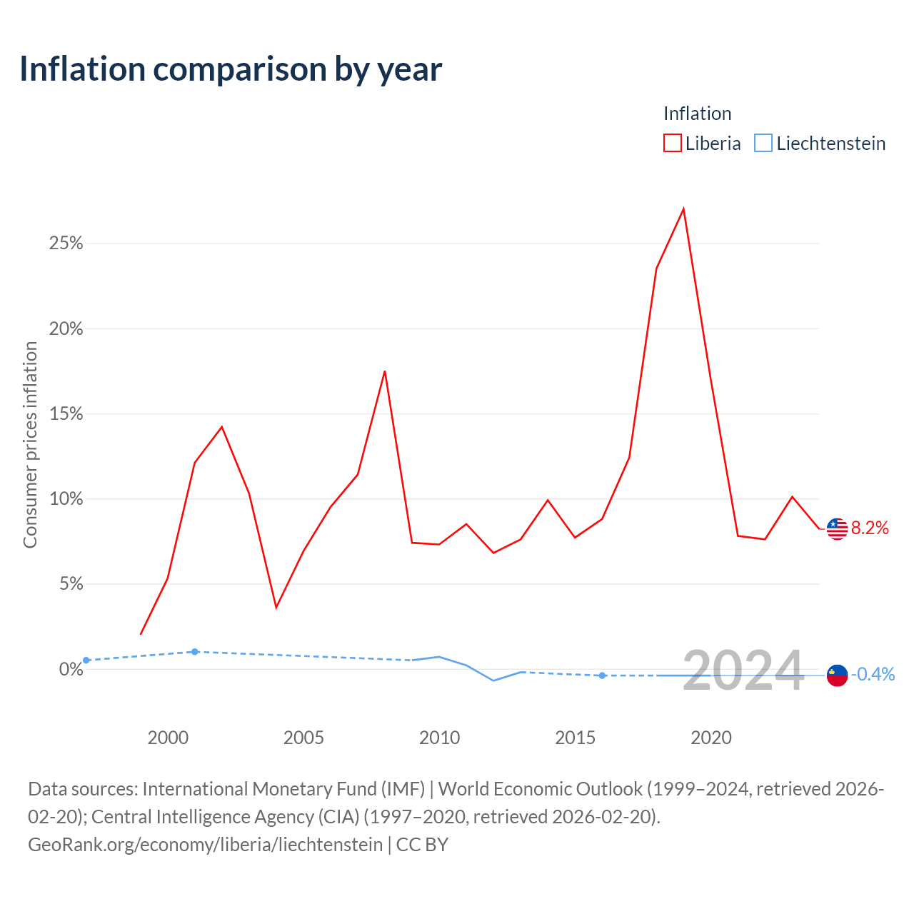 Over the past 22 years, Liberia has recorded an average annual inflation rate of 10.8%, compared with -0.01% in Liechtenstein. In 2020, inflation was 8.2% in Liberia and -0.4% in Liechtenstein.