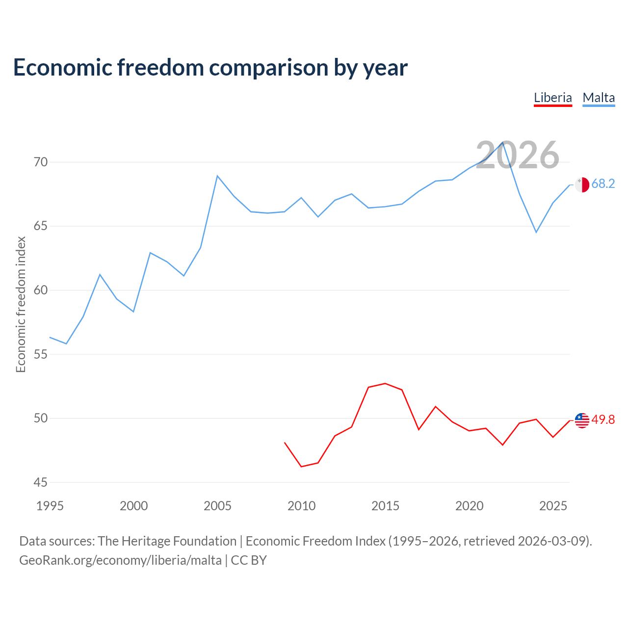 The Economic Freedom Index for Liberia is 49.8, ranking 163/197, compared to 68.2 for Malta, ranking 49/197. The chart above displays a comparison of annual changes in economic freedom indexes.