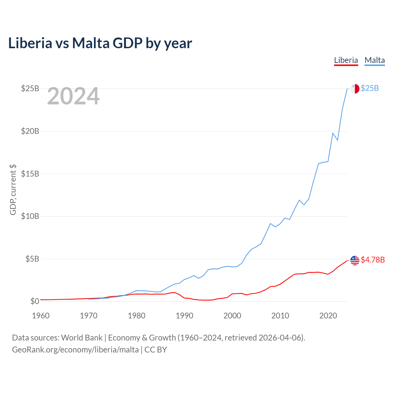 Liberia has a GDP of $4.78B compared to $25B for Malta, ranking 163/197 and 119/197 by economy size, respectively.