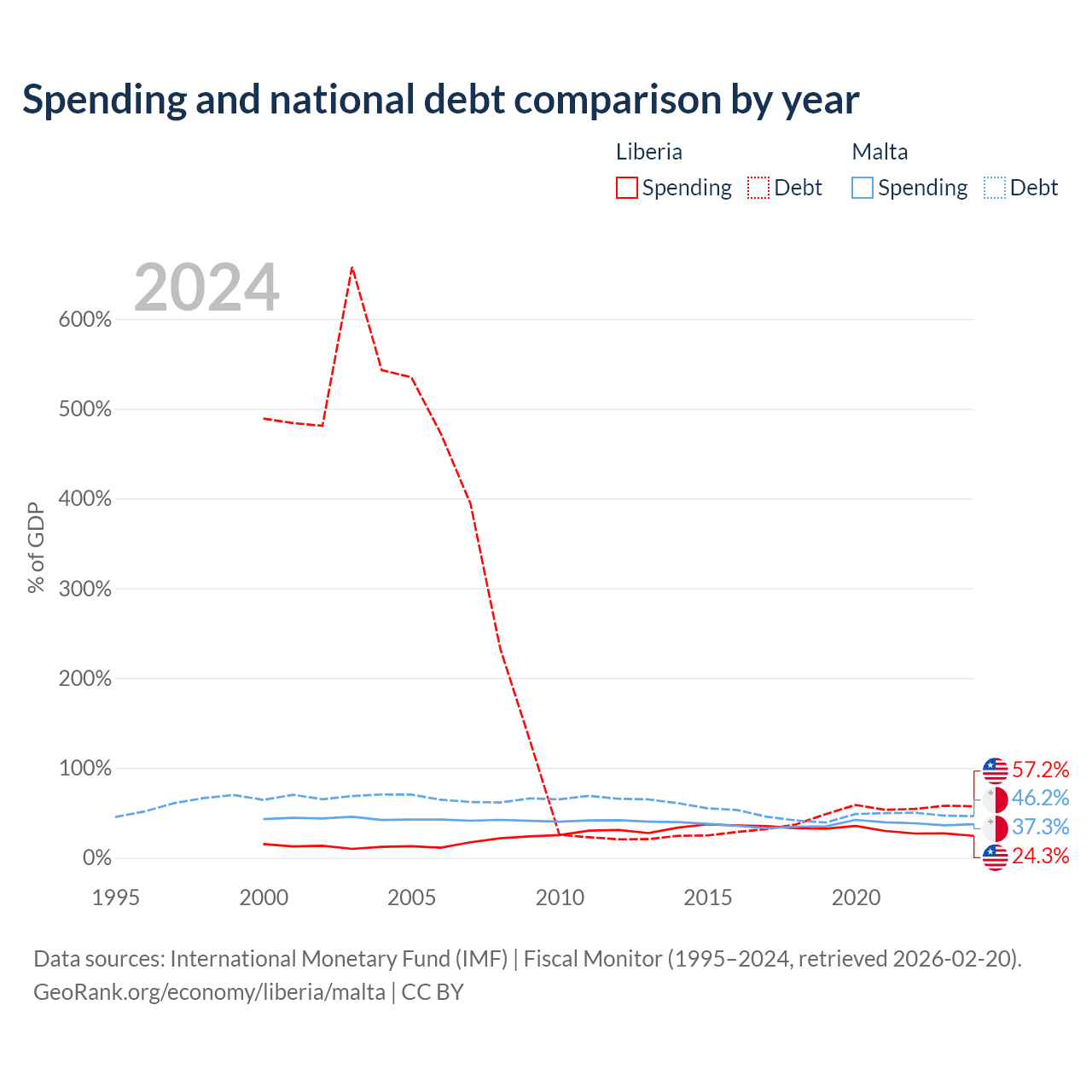Liberia has $2.73B in government debt (57.2% of GDP), compared to $11.5B (46.2% of GDP) in Malta.