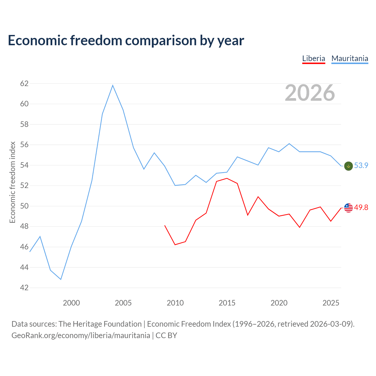 The Economic Freedom Index for Liberia is 49.8, ranking 163/197, compared to 53.9 for Mauritania, ranking 136/197. The chart above displays a comparison of annual changes in economic freedom indexes.