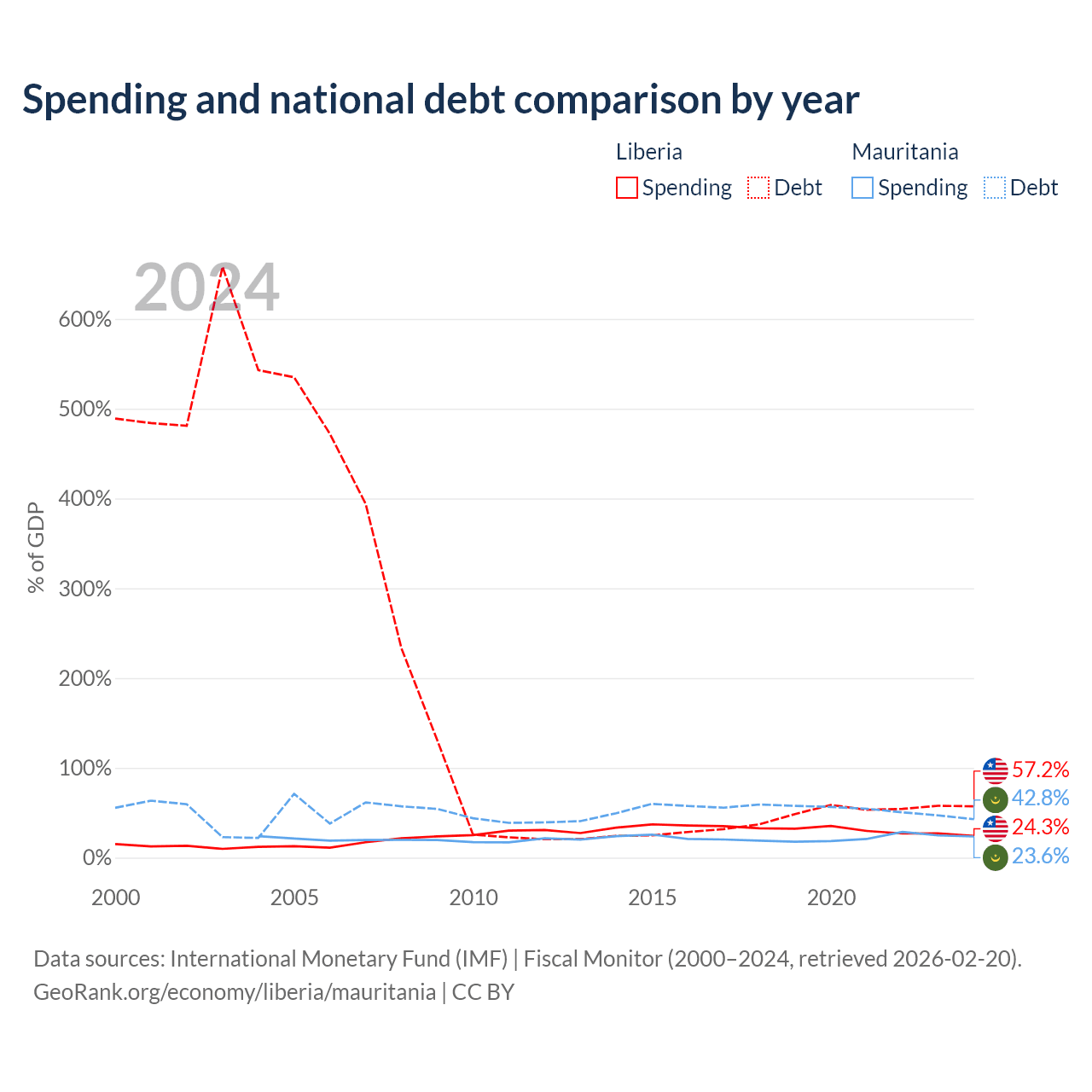 Liberia has $2.73B in government debt (57.2% of GDP), compared to $4.67B (42.8% of GDP) in Mauritania.