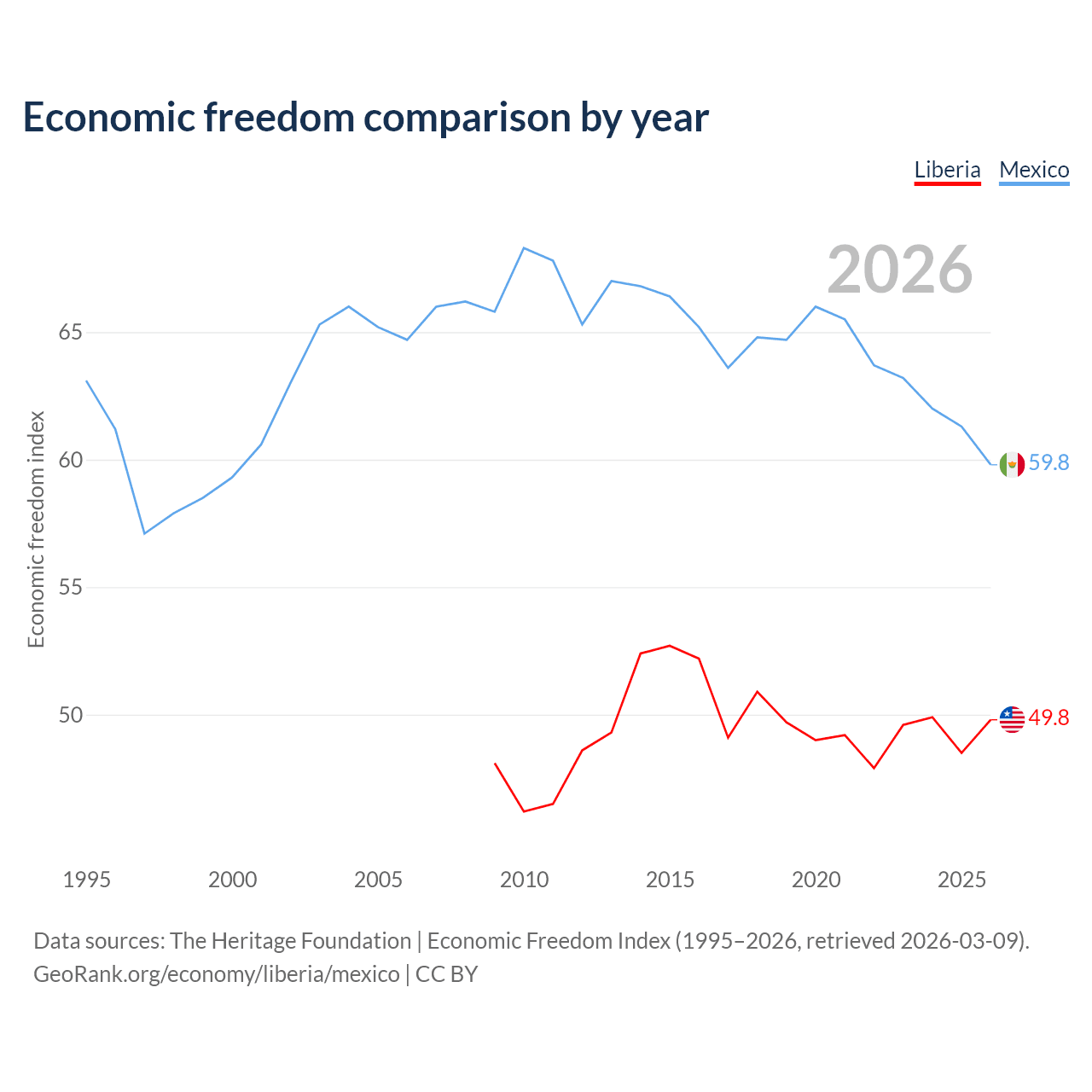 The Economic Freedom Index for Liberia is 49.8, ranking 163/197, compared to 59.8 for Mexico, ranking 102/197. The chart above displays a comparison of annual changes in economic freedom indexes.