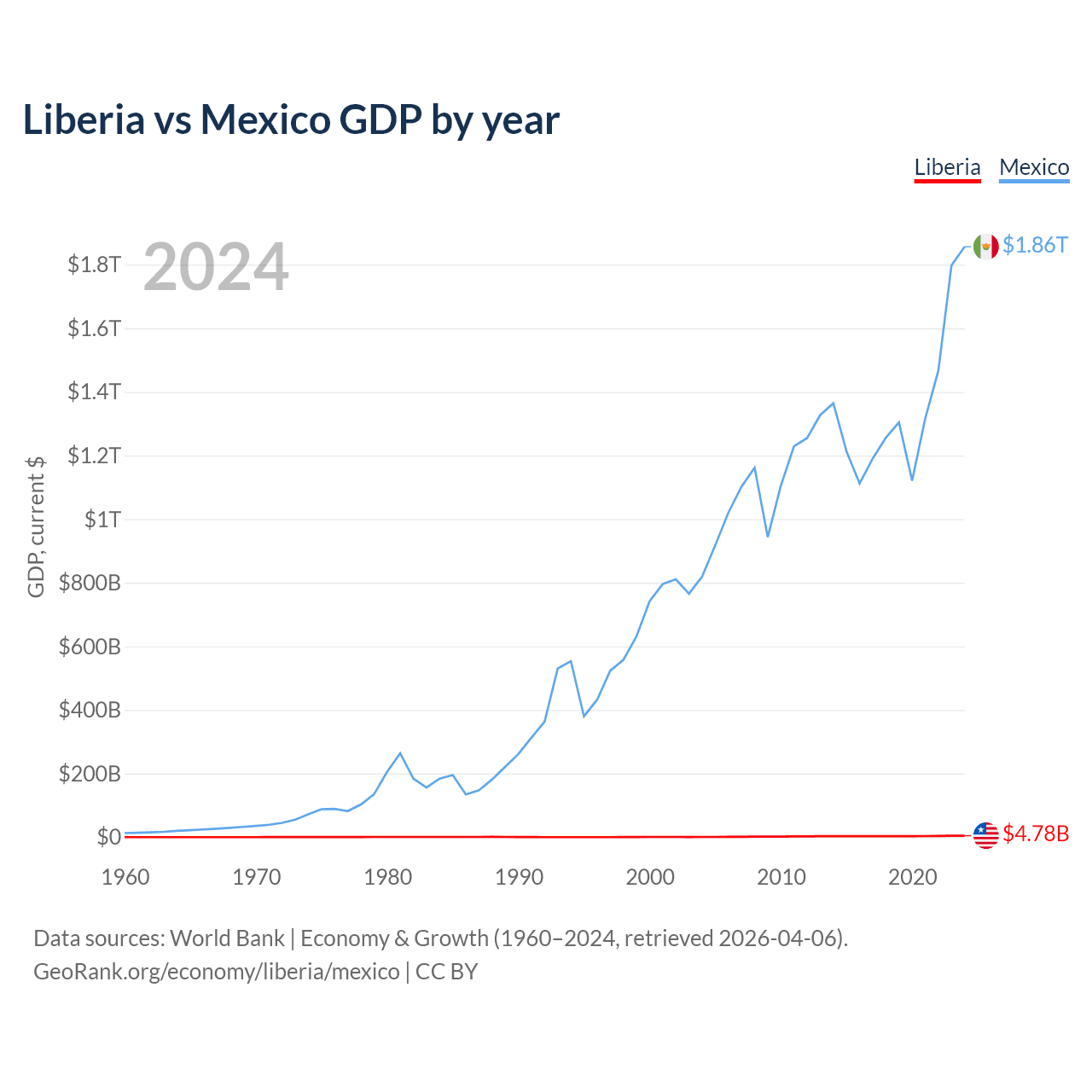 Liberia has a GDP of $4.78B compared to $1.86T for Mexico, ranking 163/197 and 13/197 by economy size, respectively.