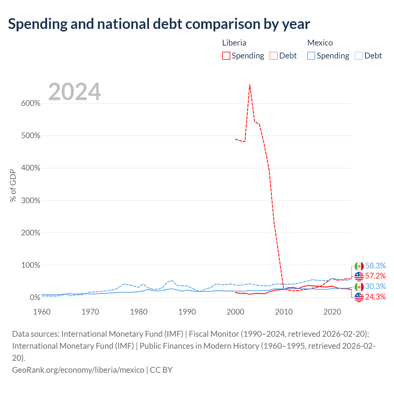 Liberia has $2.73B in government debt (57.2% of GDP), compared to $1.08T (58.3% of GDP) in Mexico.