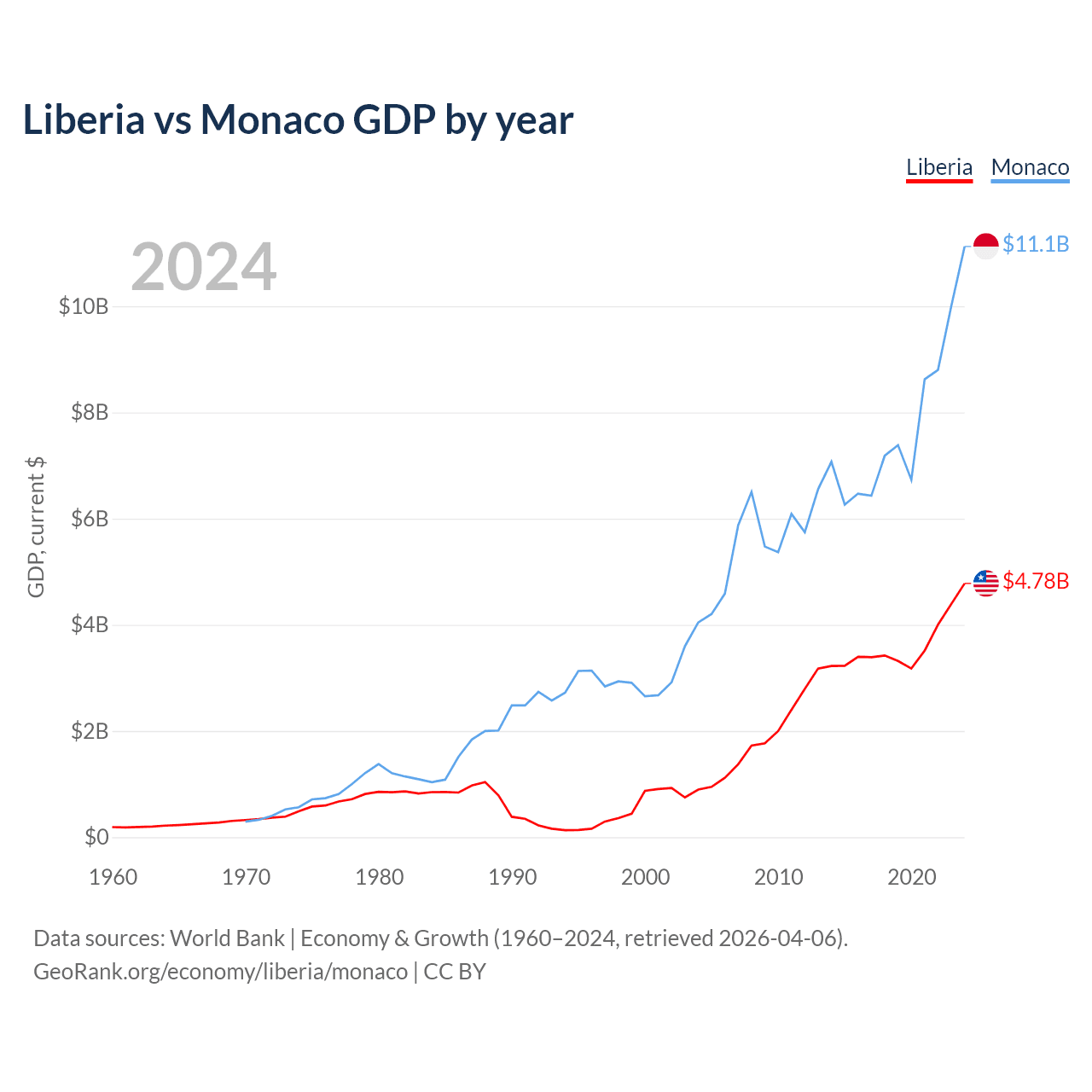 Liberia has a GDP of $4.78B compared to $11.1B for Monaco, ranking 163/197 and 152/197 by economy size, respectively.
