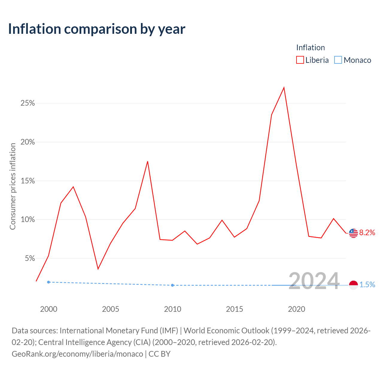 Over the past 21 years, Liberia has recorded an average annual inflation rate of 11.2%, compared with 1.58% in Monaco. In 2020, inflation was 8.2% in Liberia and 1.5% in Monaco.