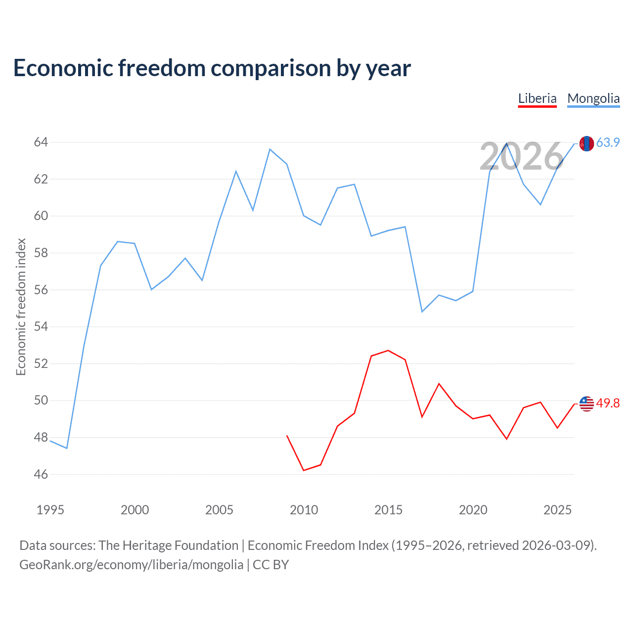 The Economic Freedom Index for Liberia is 49.8, ranking 163/197, compared to 63.9 for Mongolia, ranking 76/197. The chart above displays a comparison of annual changes in economic freedom indexes.
