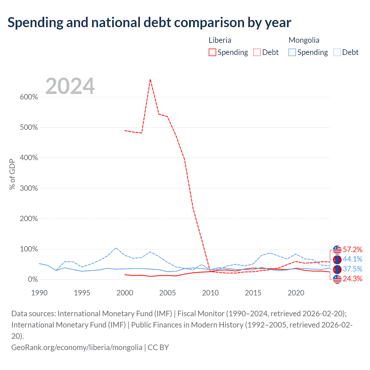 Liberia has $2.73B in government debt (57.2% of GDP), compared to $10.5B (44.1% of GDP) in Mongolia.
