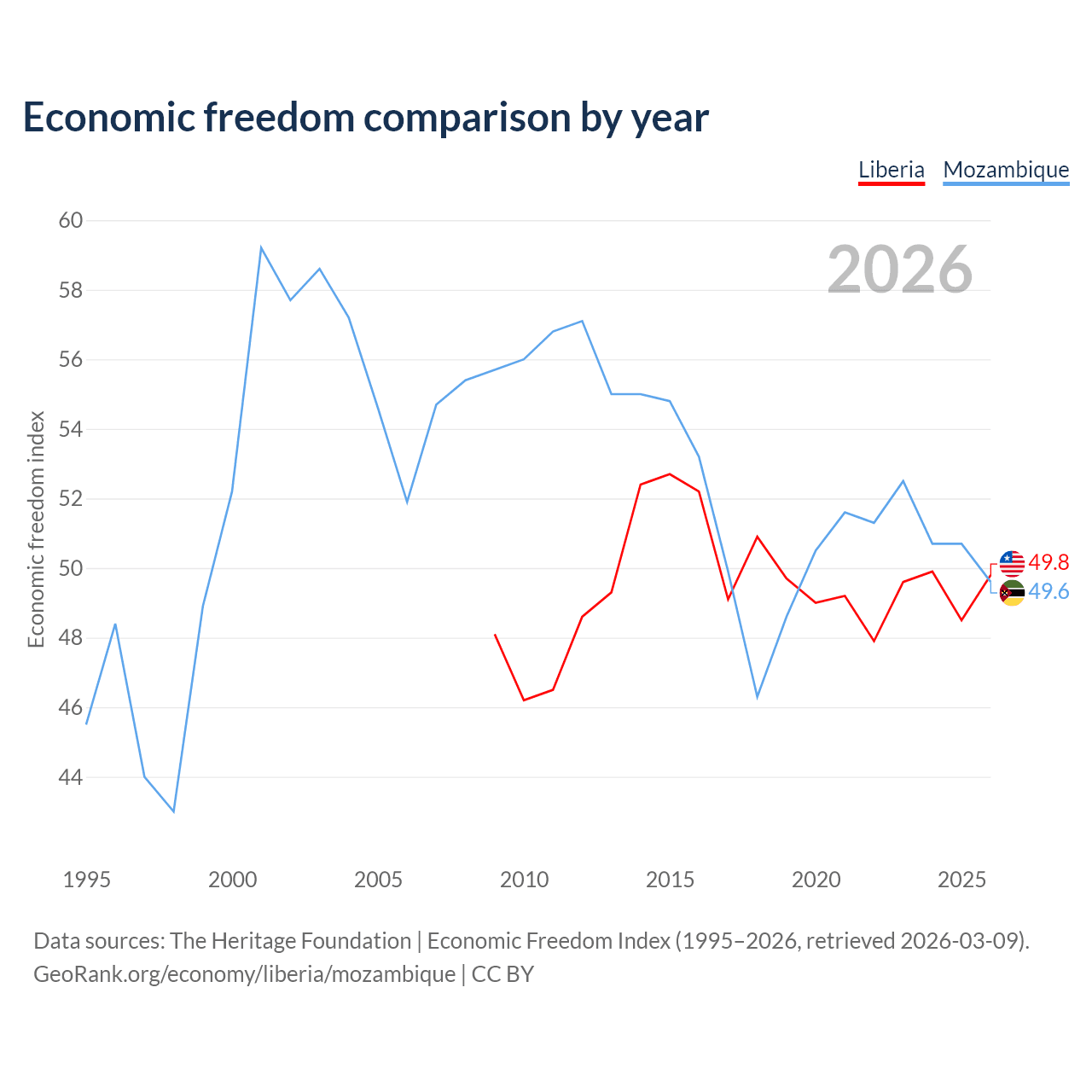 The Economic Freedom Index for Liberia is 49.8, ranking 163/197, compared to 49.6 for Mozambique, ranking 164/197. The chart above displays a comparison of annual changes in economic freedom indexes.