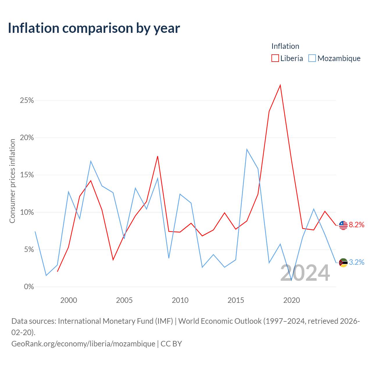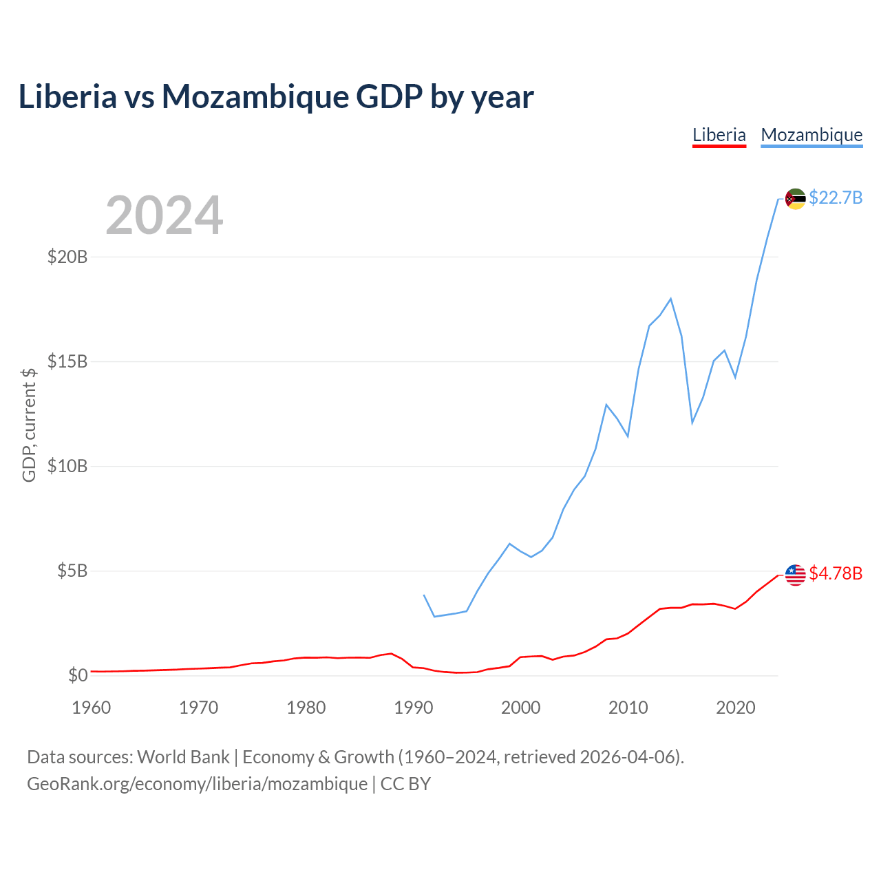 Liberia has a GDP of $4.78B compared to $22.7B for Mozambique, ranking 163/197 and 123/197 by economy size, respectively.