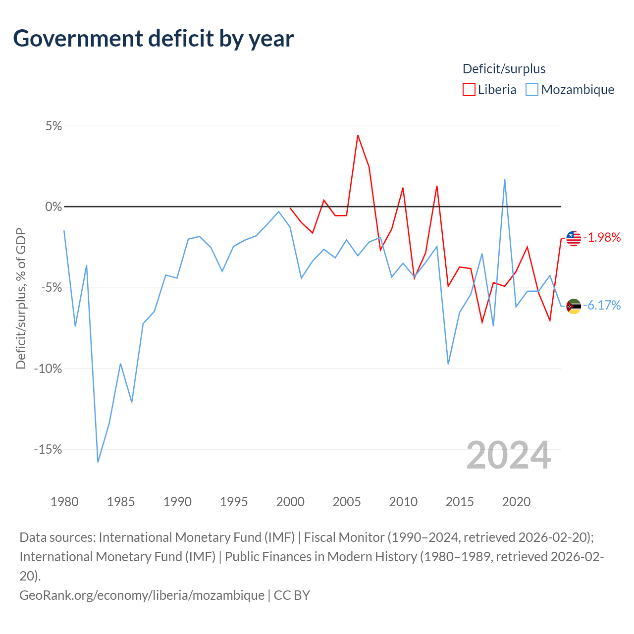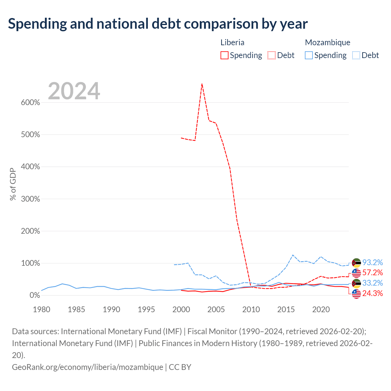 Liberia has $2.73B in government debt (57.2% of GDP), compared to $21.2B (93.2% of GDP) in Mozambique.