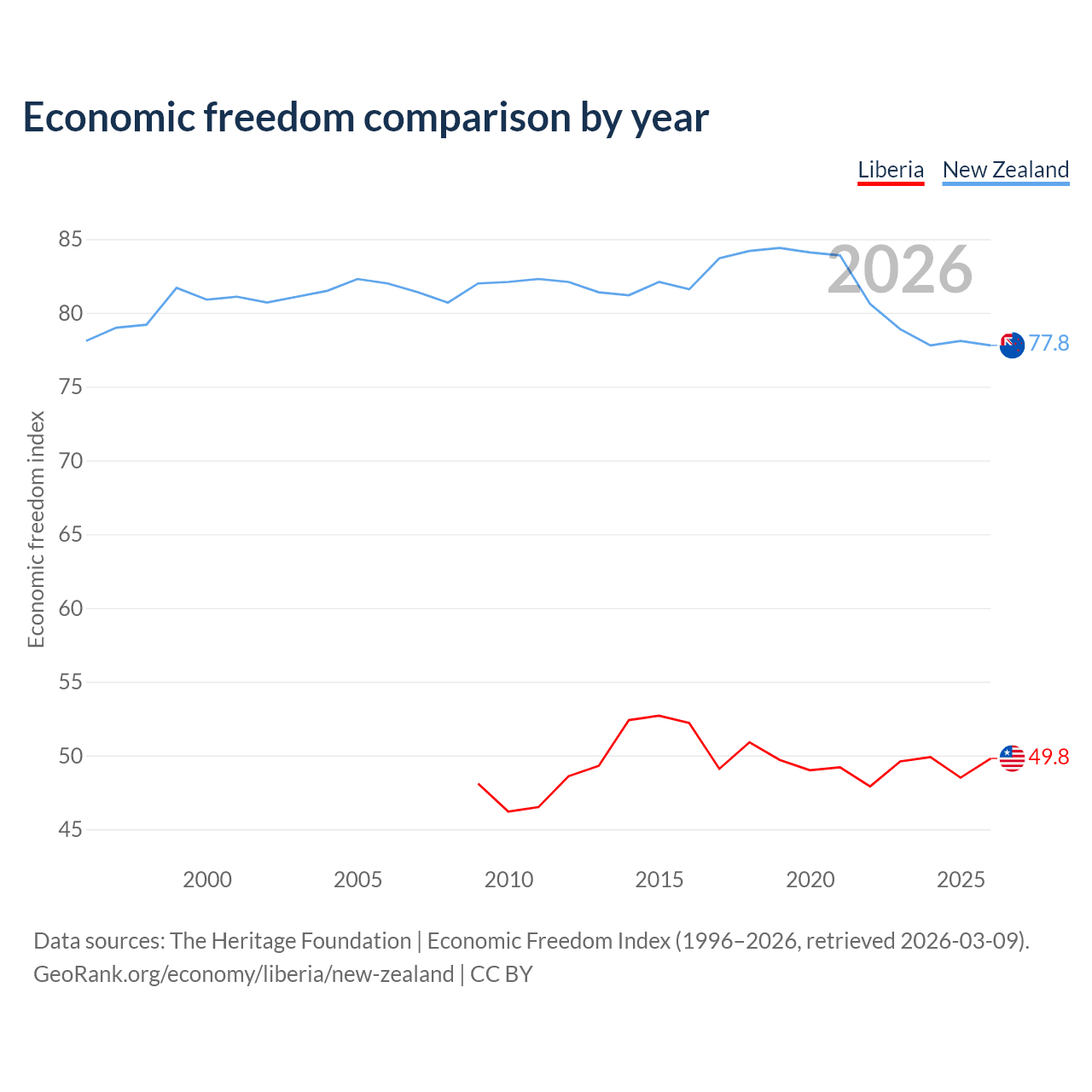 The Economic Freedom Index for Liberia is 49.8, ranking 163/197, compared to 77.8 for New Zealand, ranking 13/197. The chart above displays a comparison of annual changes in economic freedom indexes.