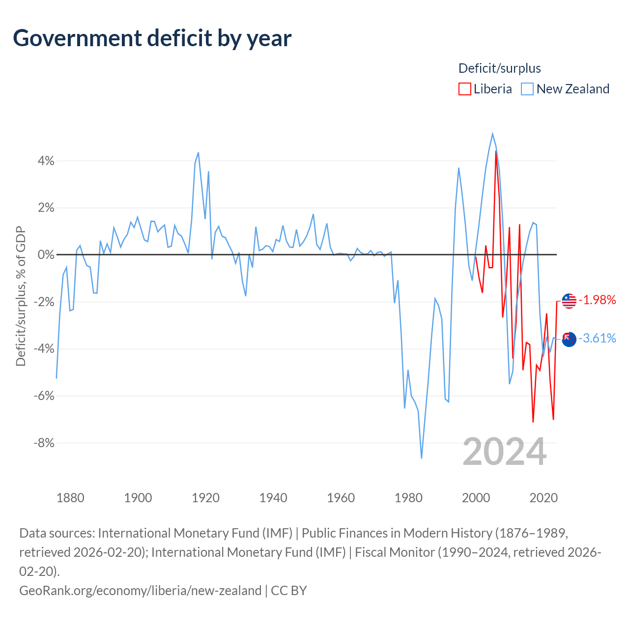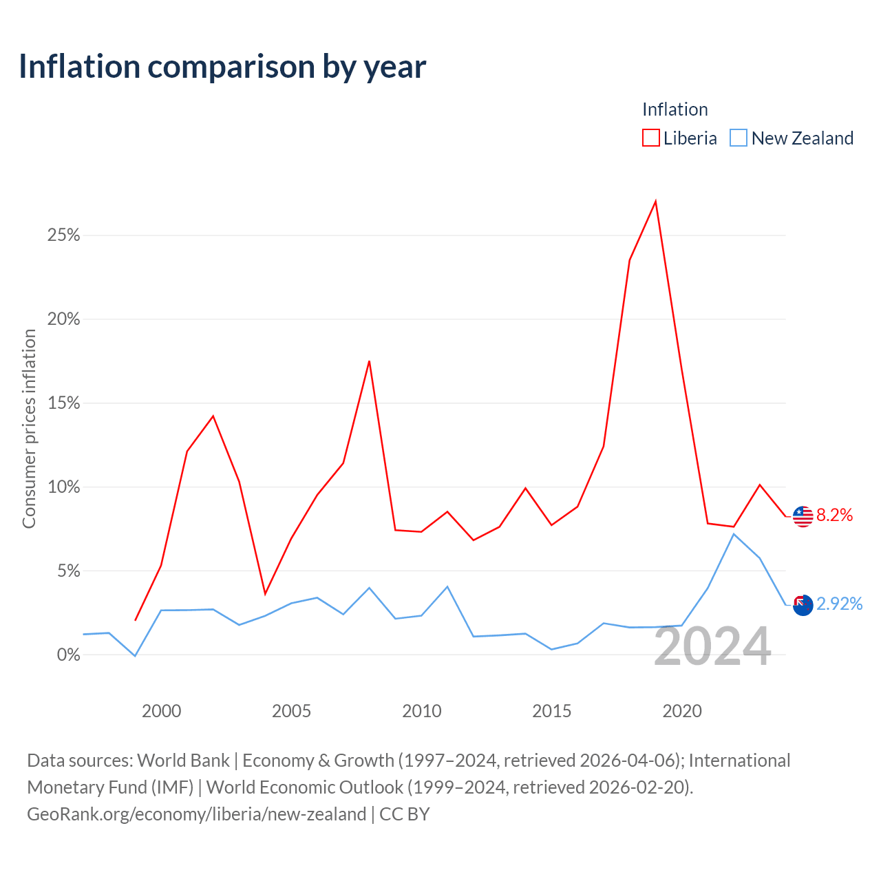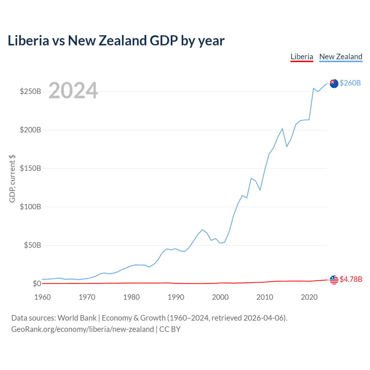 Liberia has a GDP of $4.78B compared to $260B for New Zealand, ranking 163/197 and 52/197 by economy size, respectively.