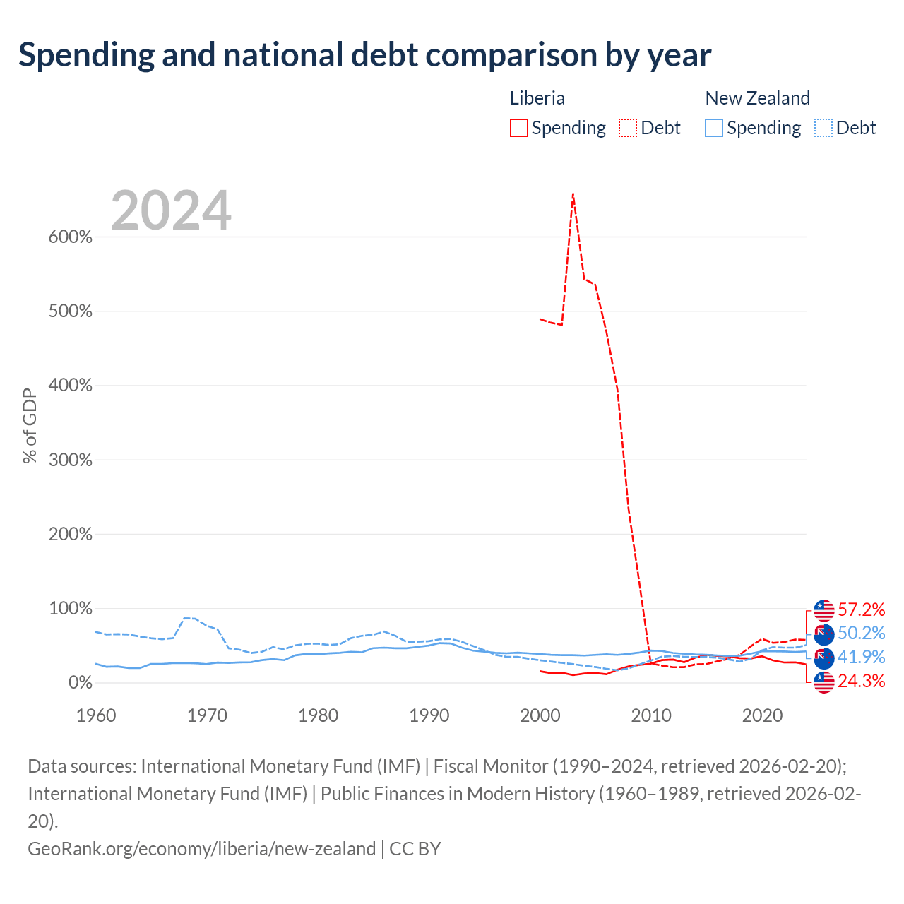 Liberia has $2.73B in government debt (57.2% of GDP), compared to $131B (50.2% of GDP) in New Zealand.