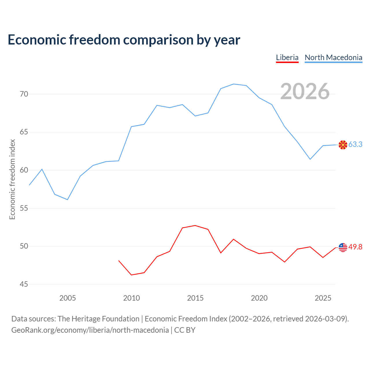 The Economic Freedom Index for Liberia is 49.8, ranking 163/197, compared to 63.3 for North Macedonia, ranking 81/197. The chart above displays a comparison of annual changes in economic freedom indexes.