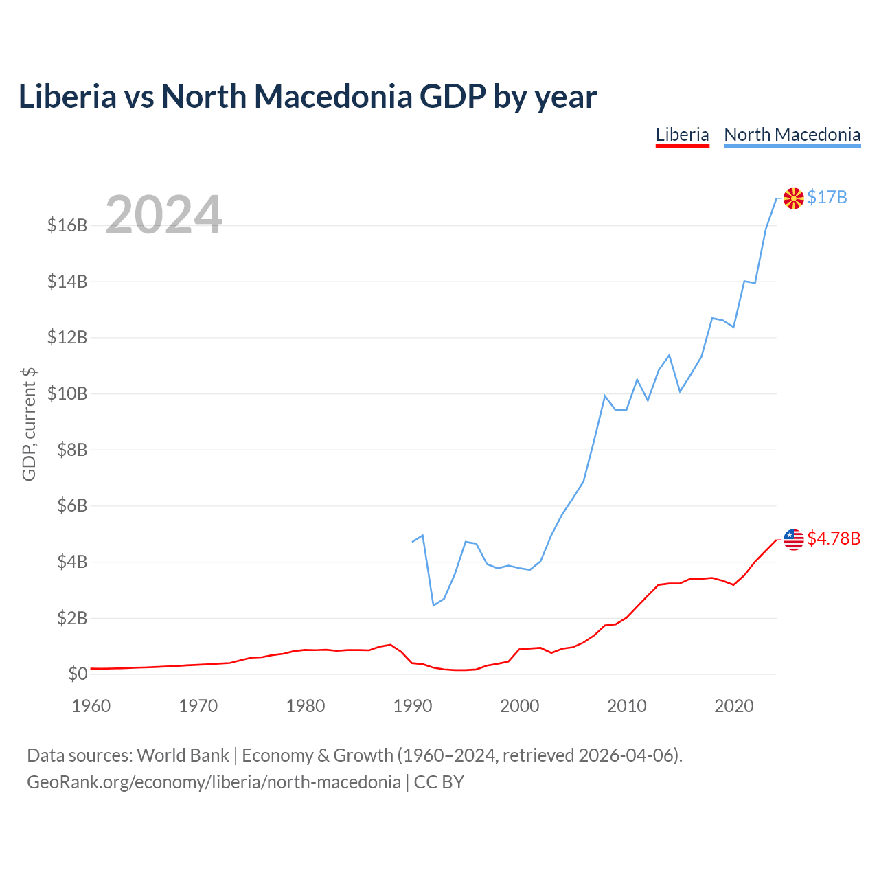 Liberia has a GDP of $4.78B compared to $17B for North Macedonia, ranking 163/197 and 138/197 by economy size, respectively.