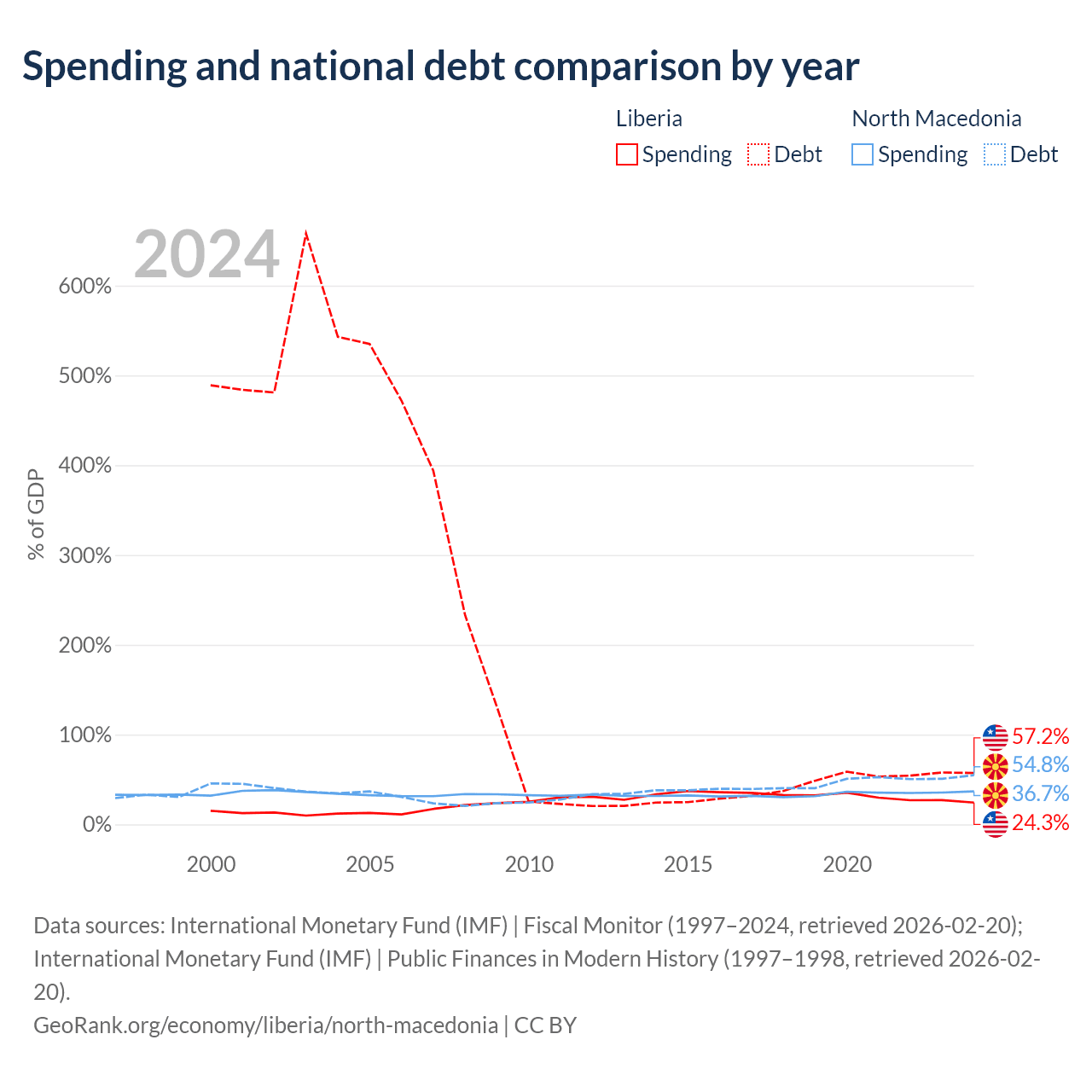 Liberia has $2.73B in government debt (57.2% of GDP), compared to $9.3B (54.8% of GDP) in North Macedonia.