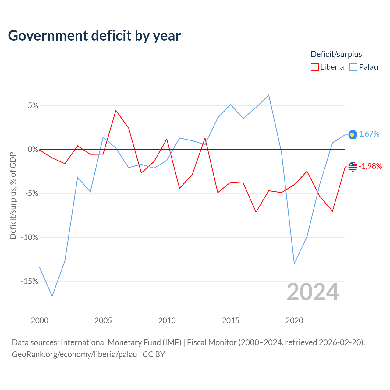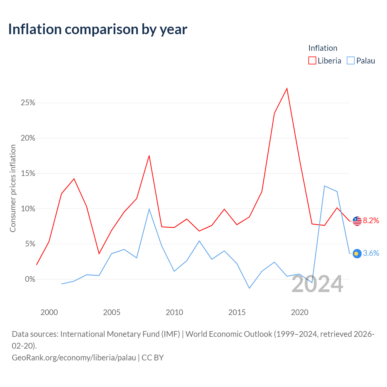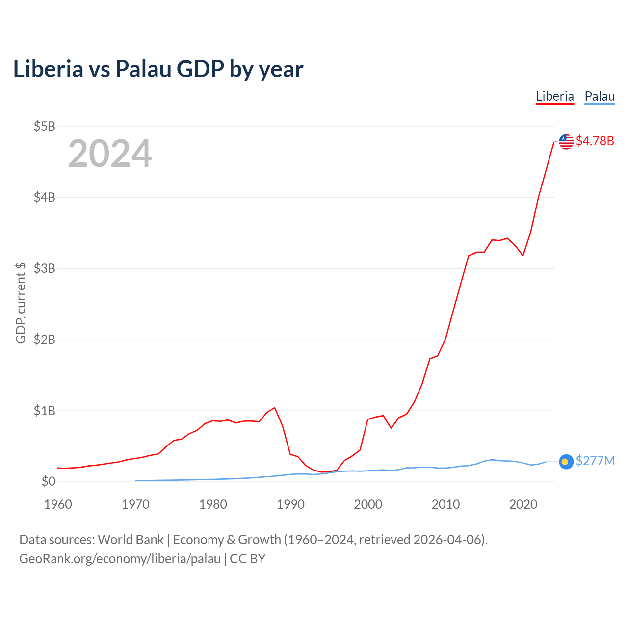 Liberia has a GDP of $4.78B compared to $277M for Palau, ranking 163/197 and 194/197 by economy size, respectively.