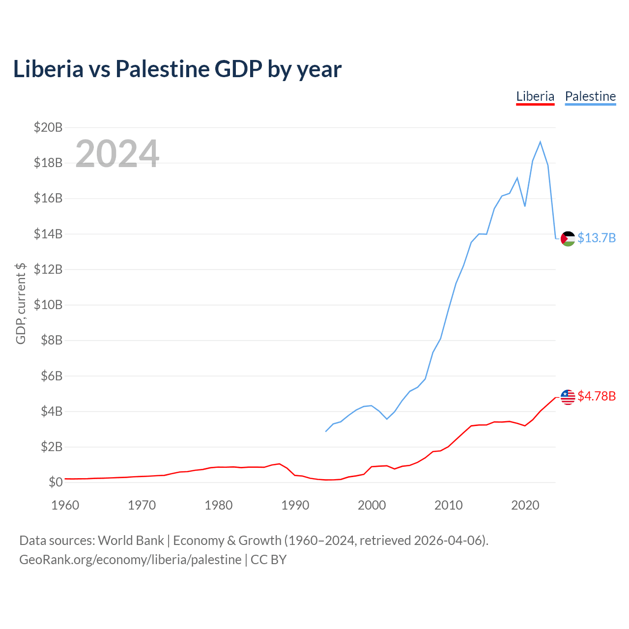 Liberia vs Palestine GDP by year