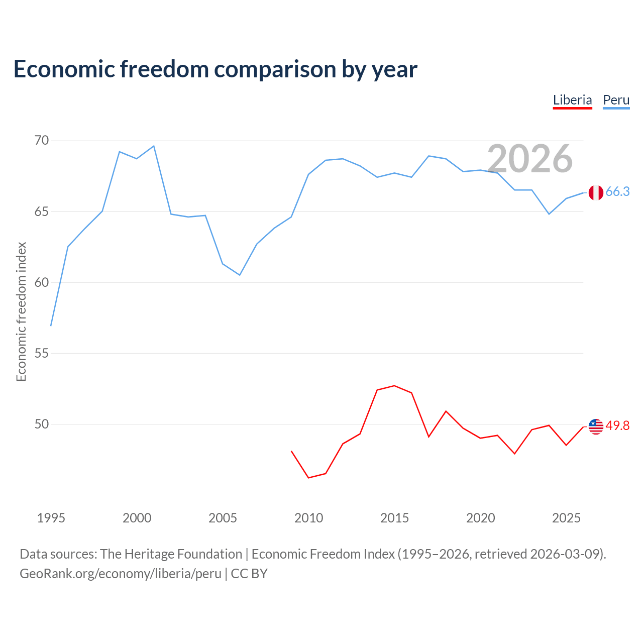 The Economic Freedom Index for Liberia is 49.8, ranking 163/197, compared to 66.3 for Peru, ranking 62/197. The chart above displays a comparison of annual changes in economic freedom indexes.