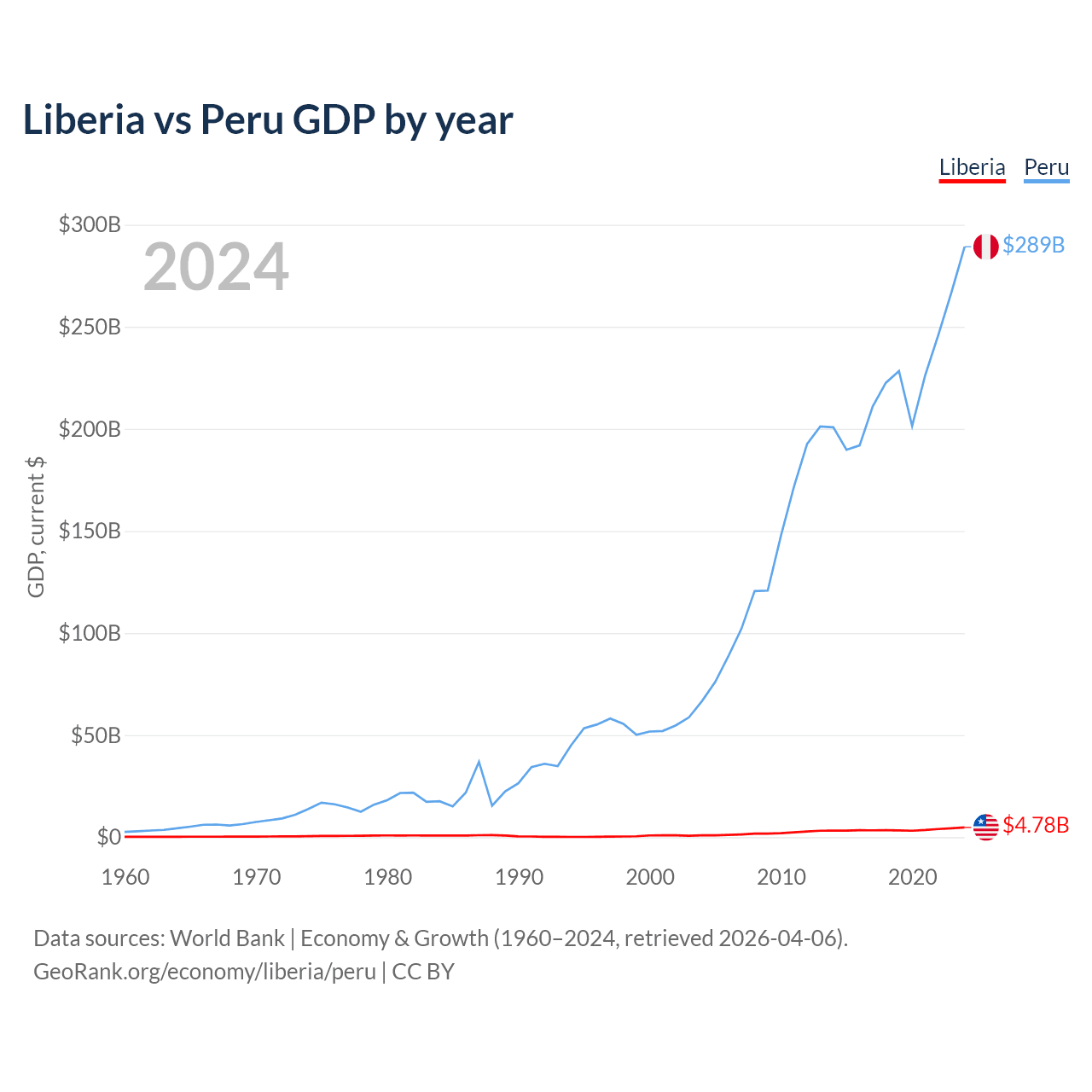 Liberia has a GDP of $4.78B compared to $289B for Peru, ranking 163/197 and 49/197 by economy size, respectively.