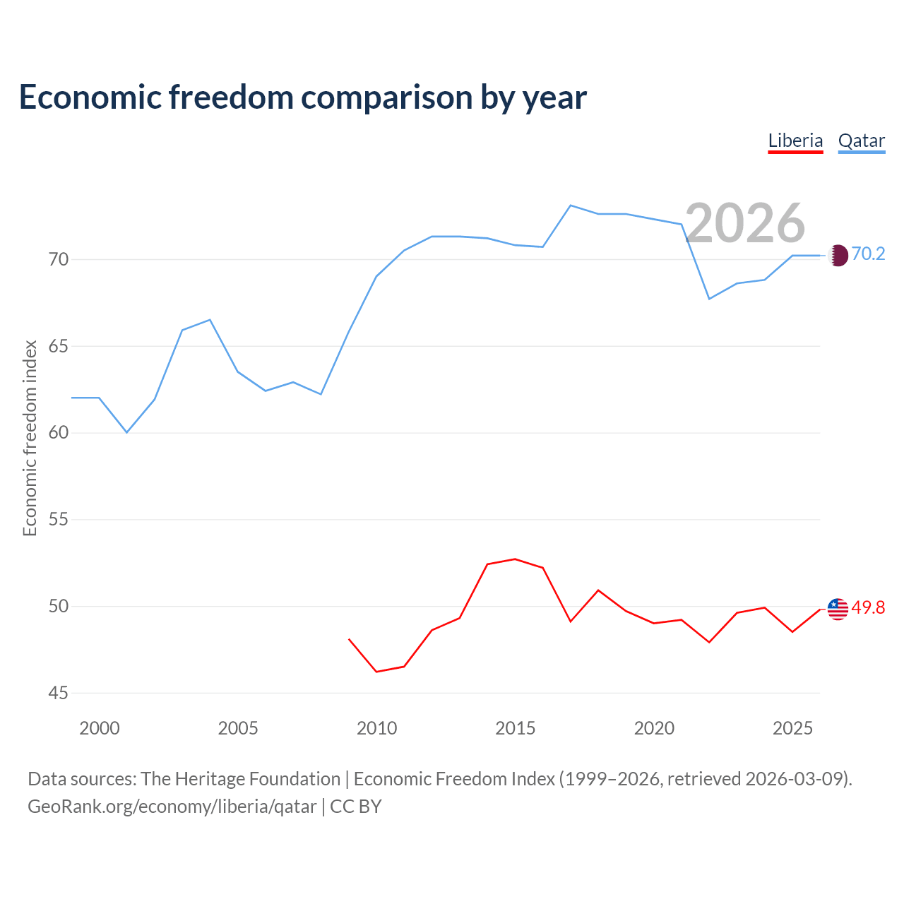 The Economic Freedom Index for Liberia is 49.8, ranking 163/197, compared to 70.2 for Qatar, ranking 37/197. The chart above displays a comparison of annual changes in economic freedom indexes.