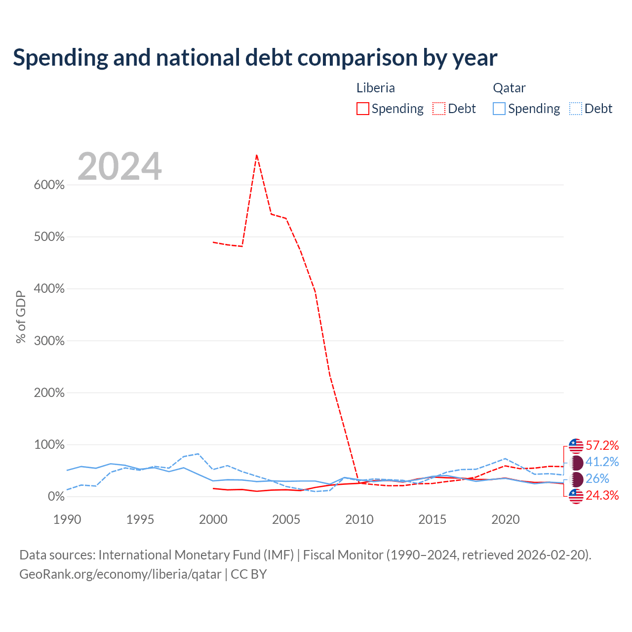 Liberia has $2.73B in government debt (57.2% of GDP), compared to $90.2B (41.2% of GDP) in Qatar.