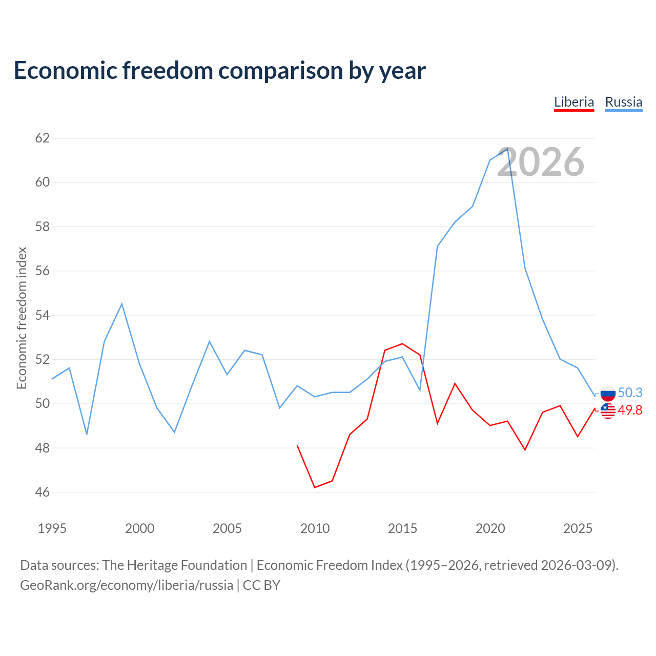 The Economic Freedom Index for Liberia is 49.8, ranking 163/197, compared to 50.3 for Russia, ranking 161/197. The chart above displays a comparison of annual changes in economic freedom indexes.