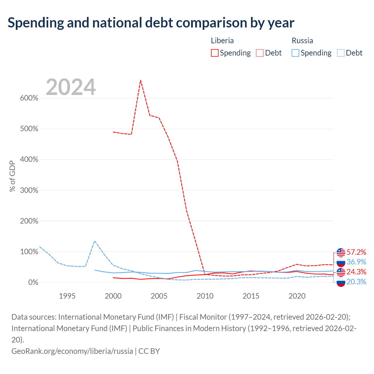 Liberia has $2.73B in government debt (57.2% of GDP), compared to $440B (20.3% of GDP) in Russia.